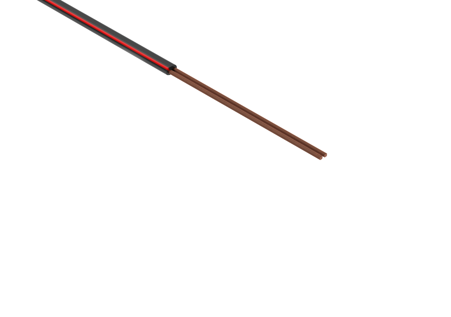 Przewód głośnikowy z żyłami miedzianymi, wielodrutowymi. Izolacja z polwinitu. Przekrój płaski. Jedna żyła oznazona paskiem w kolorze czerwonym.
