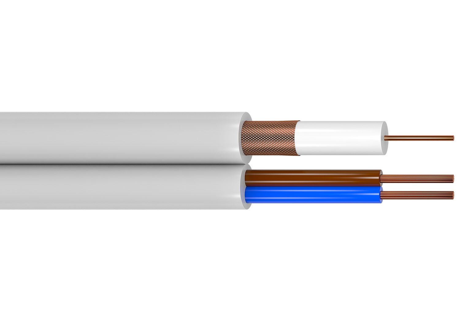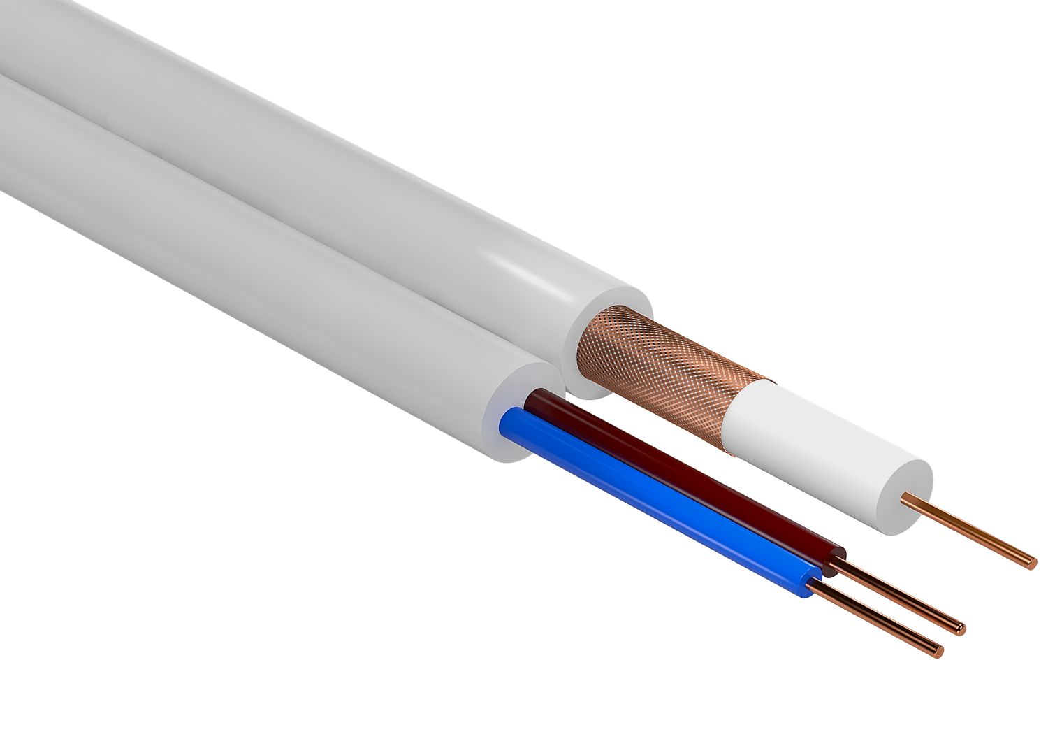 Przewód współosiowy: żyła główna miedziana o średnicy 0,59mm, izolacja żyły: polietylen jednolity, ekran oplot miedziany 75%, powłoka zewnętrzna PVC; Przewód zasilający: żyły miedziane wielodrutowe o przekroju 0,5mm² w izolacji polwinitowej oraz powłoce zewnętrznej PVC standardowo w kolorze białym