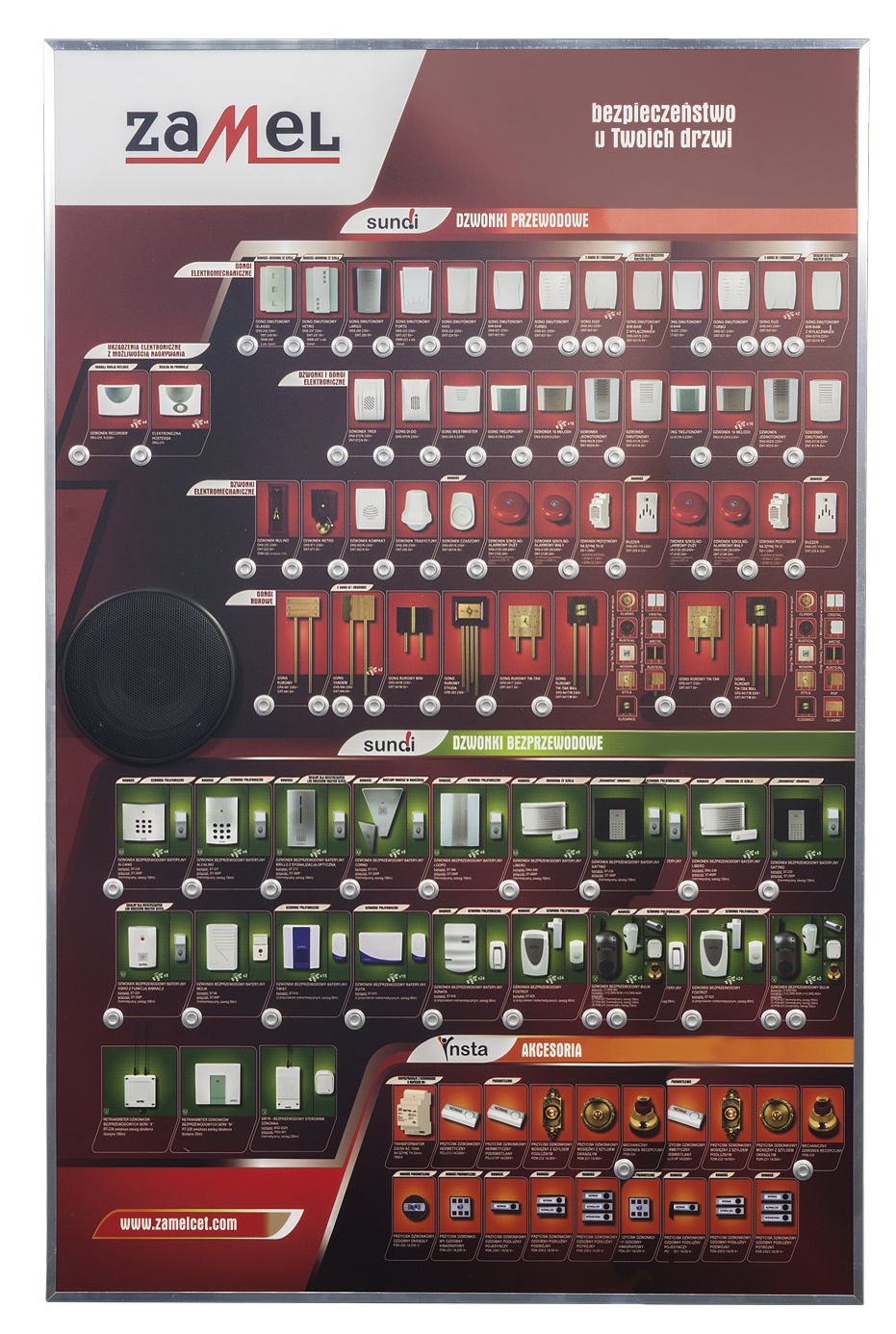 - tablica elektroniczna prezentuje pełną ofertę dzwonków, gongów, a także akcesoriów dzwonkowych firmy Zamel oraz Bittorf,