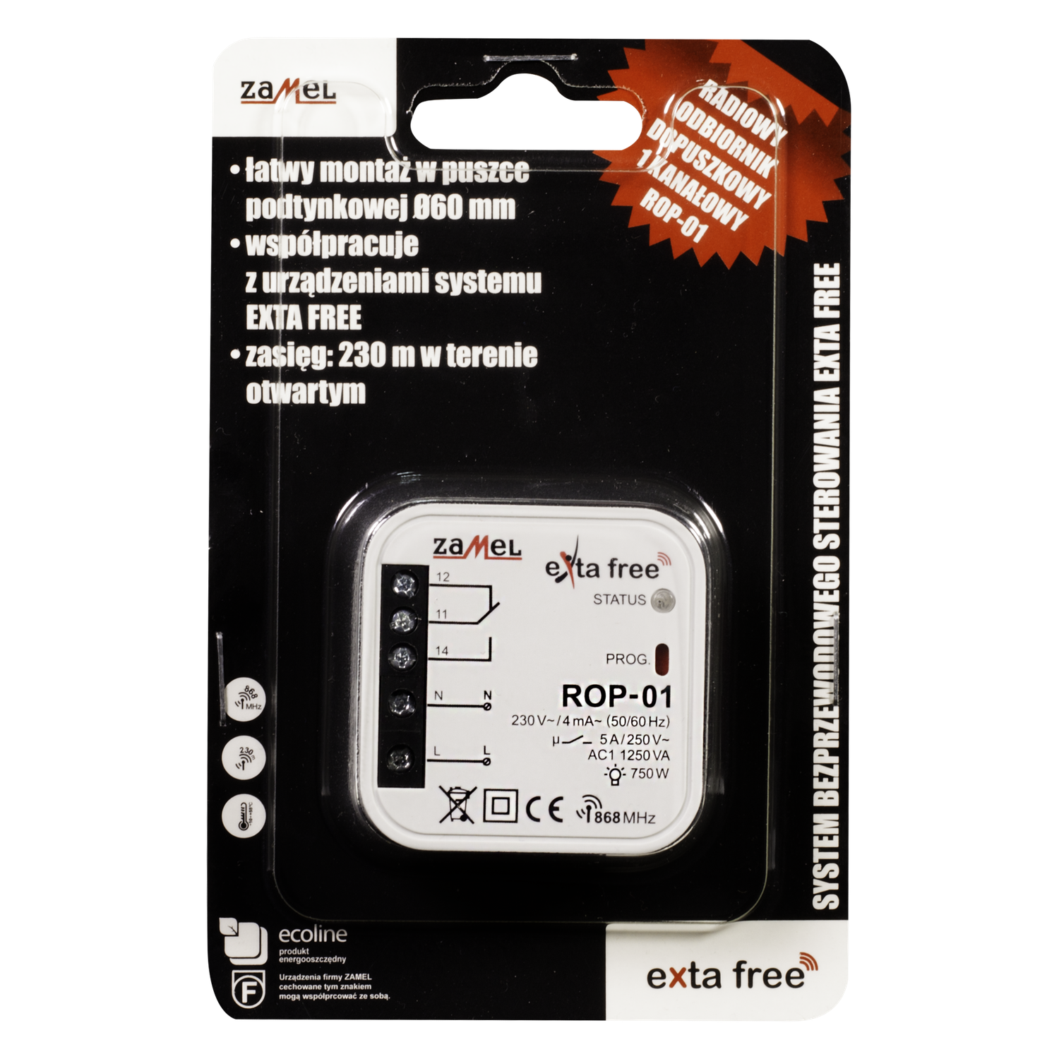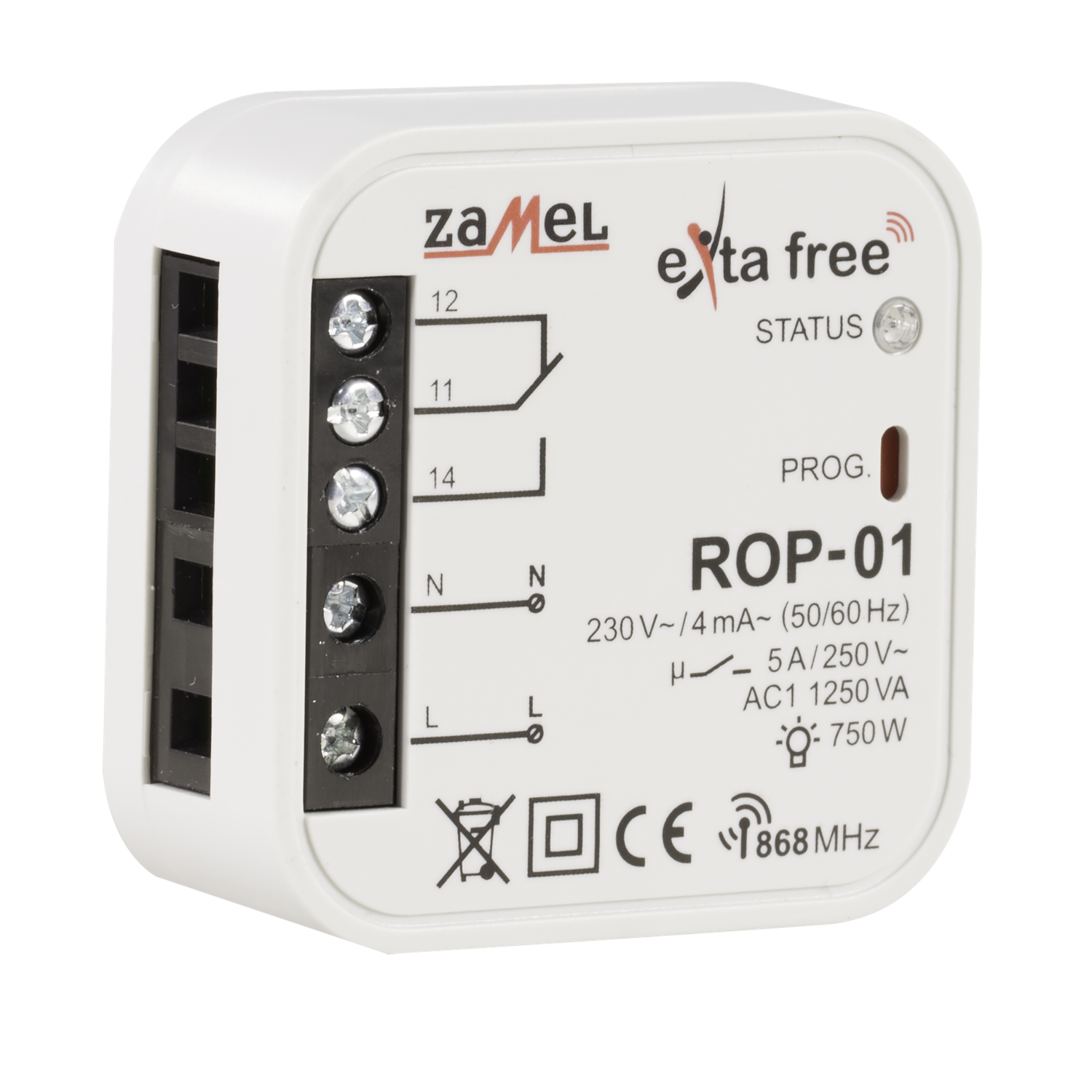 Funkempfänger werden als Unterputz- und AUfputzelemente (Anschlussdose) verwendet und als Ansteuerungen direkt in Beleuchtungsvorrichtungen installiert. ROP-01 bietet 5 Betriebsmodi an: anschalten, ausschalten, monostabiler Modus, bistabiler Modus und Zeitmodus (Ausschaltverzögerung).
