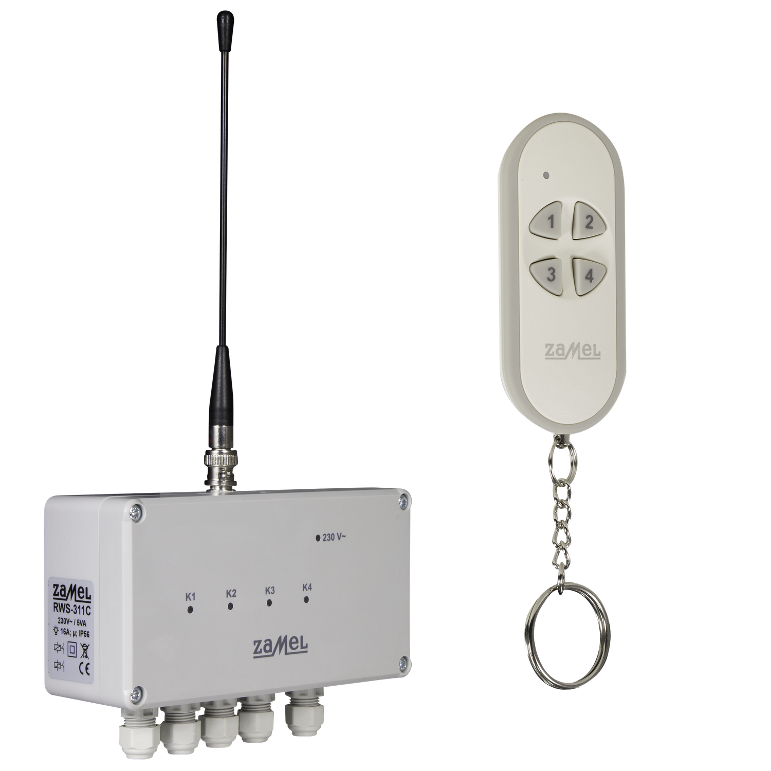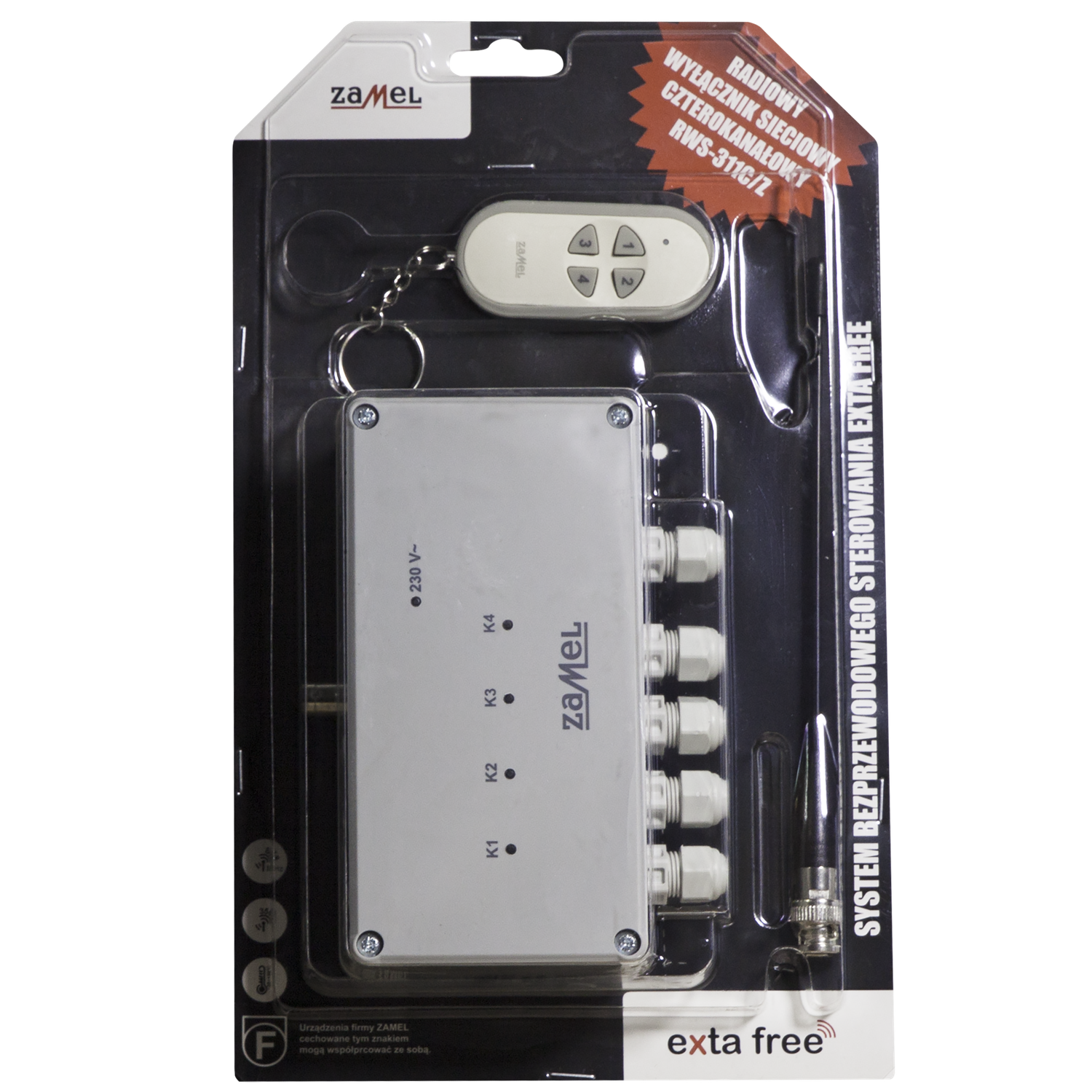 Radiowy wyłącznik sieciowy RWS-311C/Z przeznaczony jest do zdalnego (drogą radiową) sterowania wszelkiego rodzaju urządzeniami elektrycznymi takimi jak: silniki, lampy, napędy bram, pompy, oświetlenie ogrodowe itp. Urządzenie działa w oparciu o protokół zgodny z bezprzewodowym systemem exta free i współpracuje z nadajnikami tego systemu. Do transmisji pomiędzy nadajnikiem a odbiornikiem wykorzystano fale radiowe o częstotliwości 868 MHz. Odbiornik posiada hermetyczną obudowę (IP56), dlatego może być montowany na zewnątrz pomieszczeń i może pracować w trudnych warunkach atmosferycznych. Wyłącznik RWS-311C zasilany jest bezpośrednio z sieci 230 V AC. Posiada cztery wyjścia przekaźnikowe o układzie styków NO. Obciążalność styku przekaźnika to 16 A / 250 V AC 4000 VA AC1. Korzystając z RWS-311C/Z można niezależnie sterować maksymalnie czterema obwodami elektrycznymi. Współpraca z bezprzewodowym systemem exta free daje bardzo duże możliwości sterowania. W przypadku zestawu RWS-311C/Z w komplecie z wyłącznikiem znajduje się pilot 4-przyciskowy P-257/4. Do odbiornika można przypisać także inne nadajniki (maksymalnie 113).