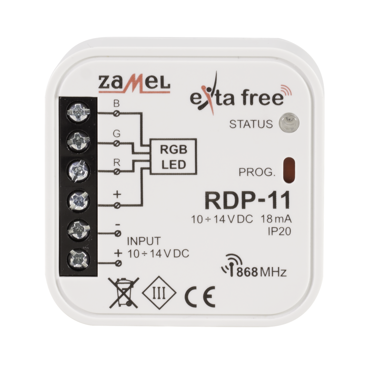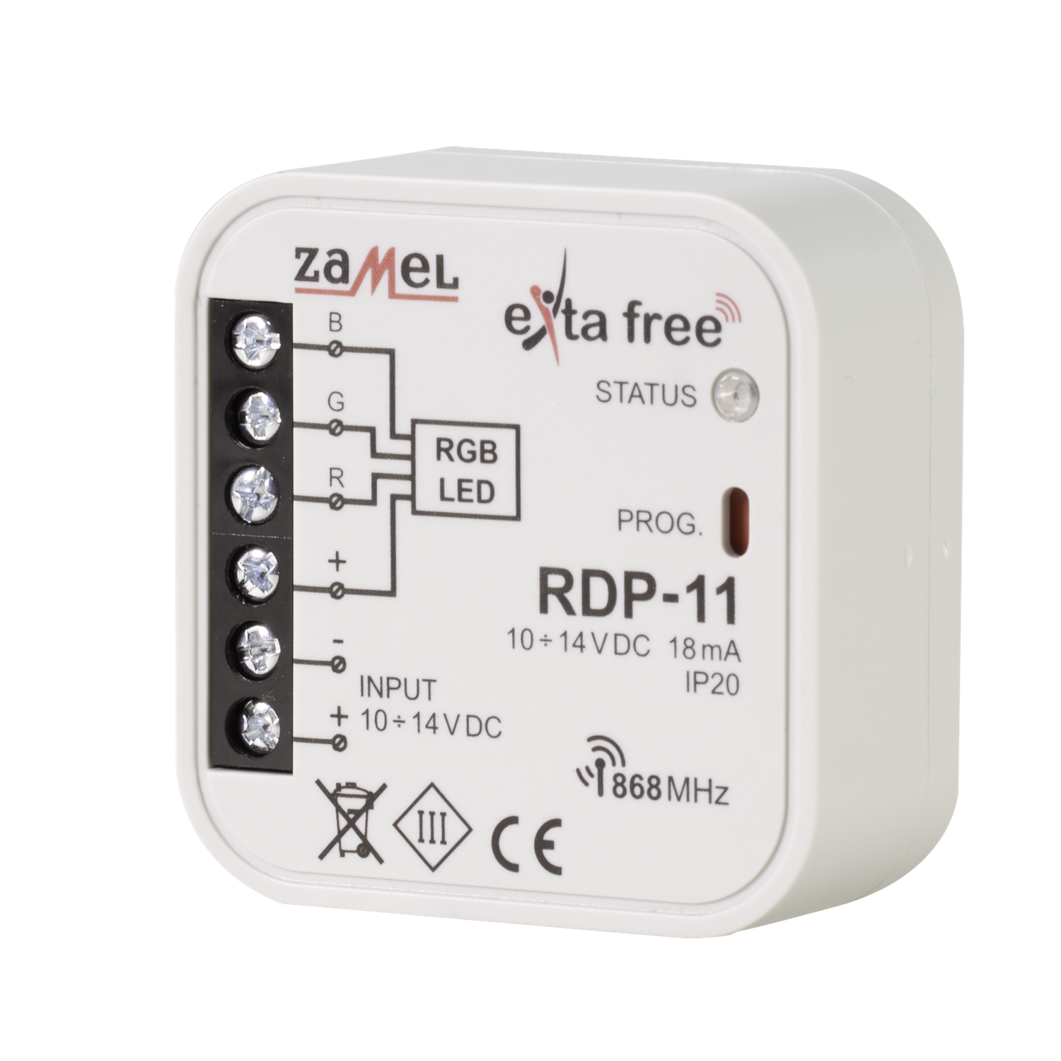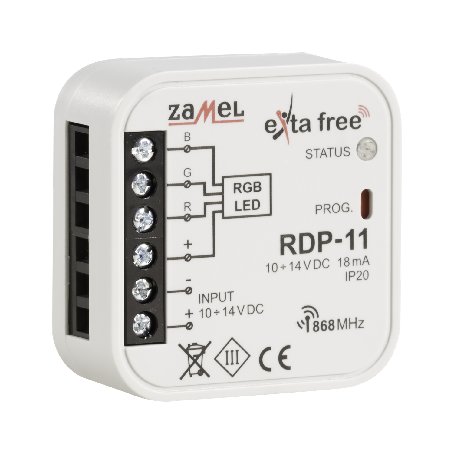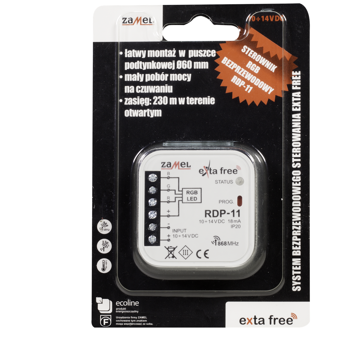 RDP-11 ist für RGB-LED-Produkte bestimmt, 10 ÷14 V DC (LED-Strips, LED_Module RGB-LED Leuchten). Steuerung erfolgt kabellos mit ausgewählten EXTA FREE Funk-Sender oder Touch-Sender P-260. Funktionen: anschalten/ausschalten, hellen/dimmen, Farbauswahl (1 von 10), automatischer flüssiger Farbwechsel (FLOATING).
