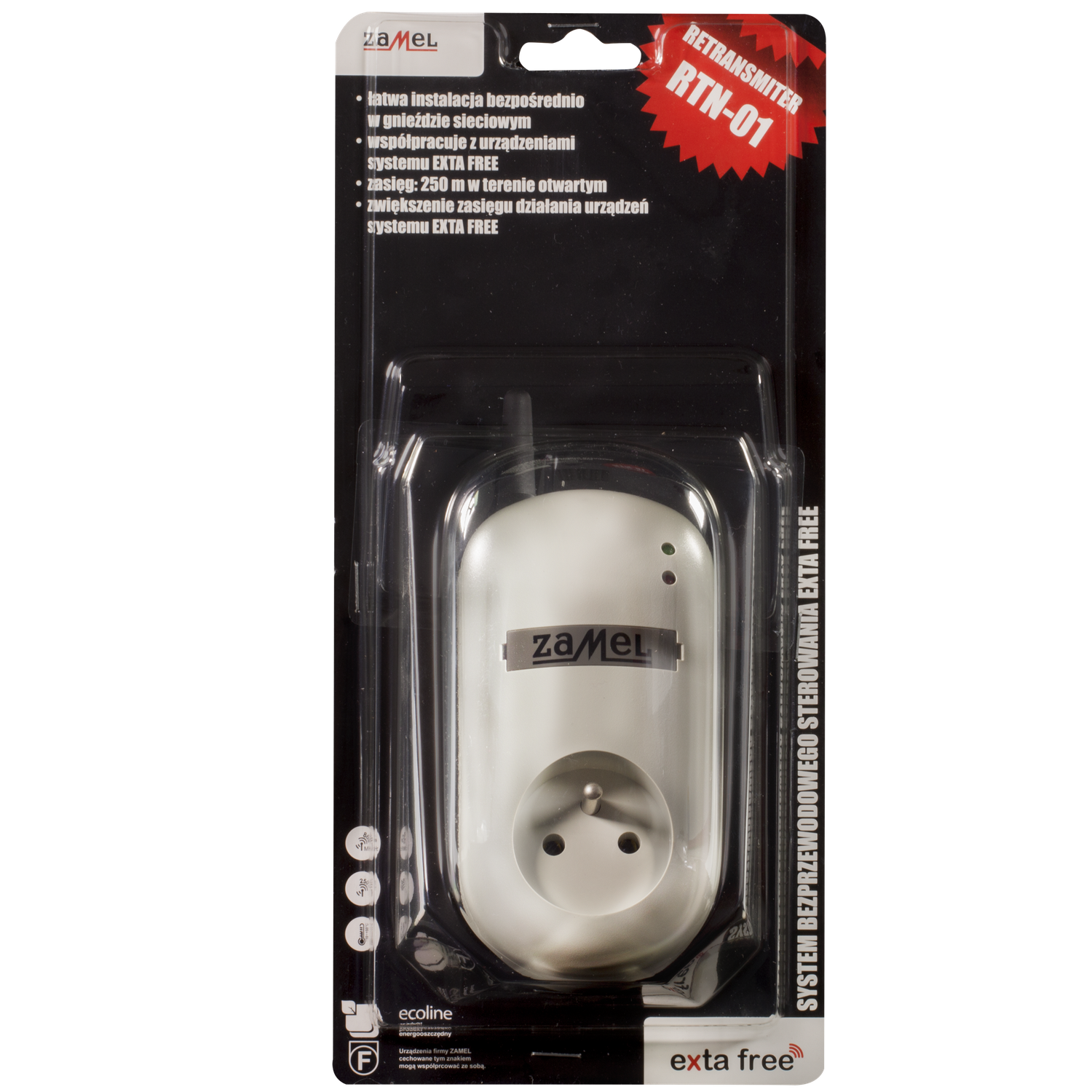 Der RTN-01-Retransmitter ist ein Gerät, das die Signalreichweite von Funksendern des drahtlosen Steuerungssystems EXTA FREE erhöht. Das System kann bis zu vier Retransmitter benutzen, wodurch sich der Abstand zwischen Sender und Empfänger auf bis zu 1000 m vergrößern lässt. Das Gerät verfügt über eine 230-V-Durchgangsbuchse, an die wir jeden Empfänger anschließen können. Dank dieser Lösung blockiert der Retransmitter die Netzwerkbuchse nicht.