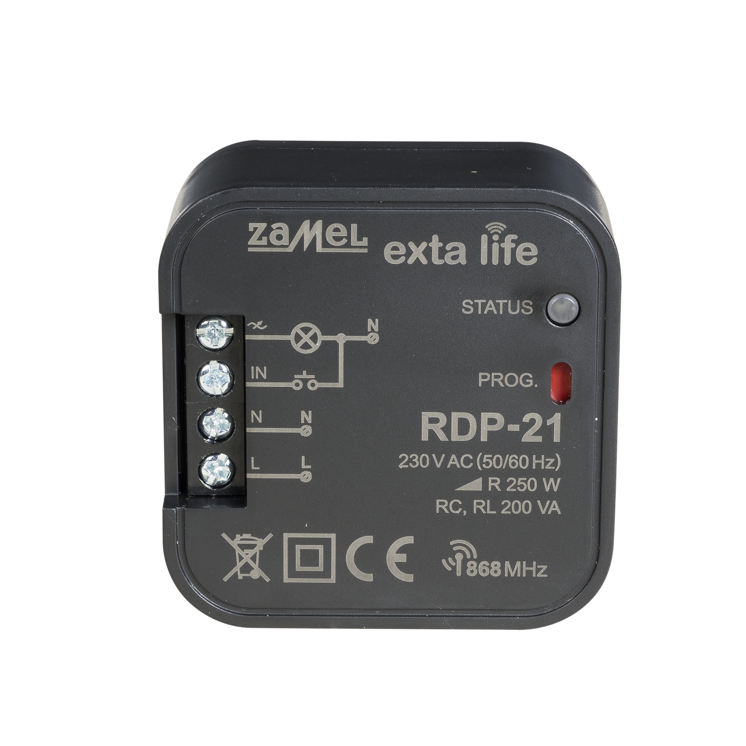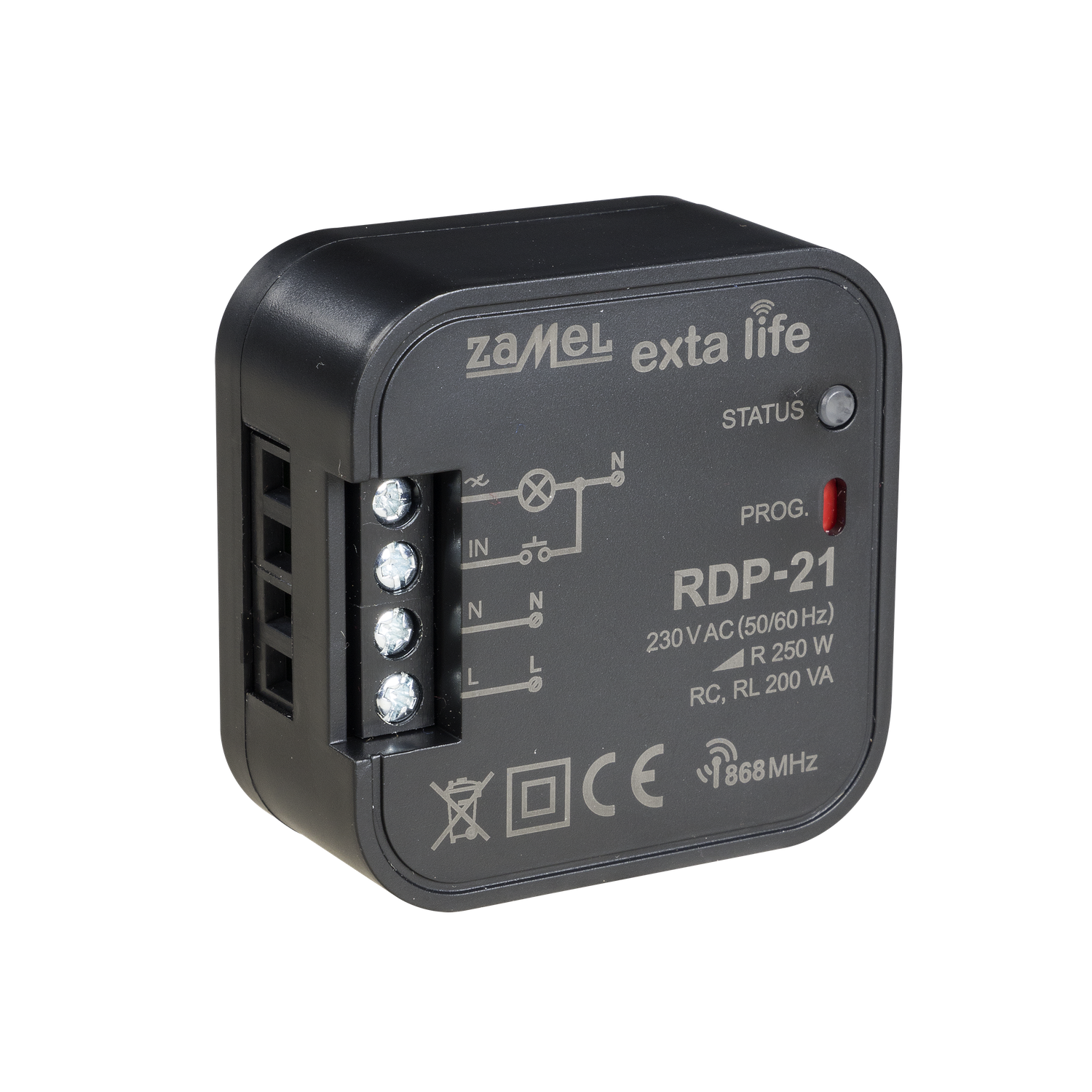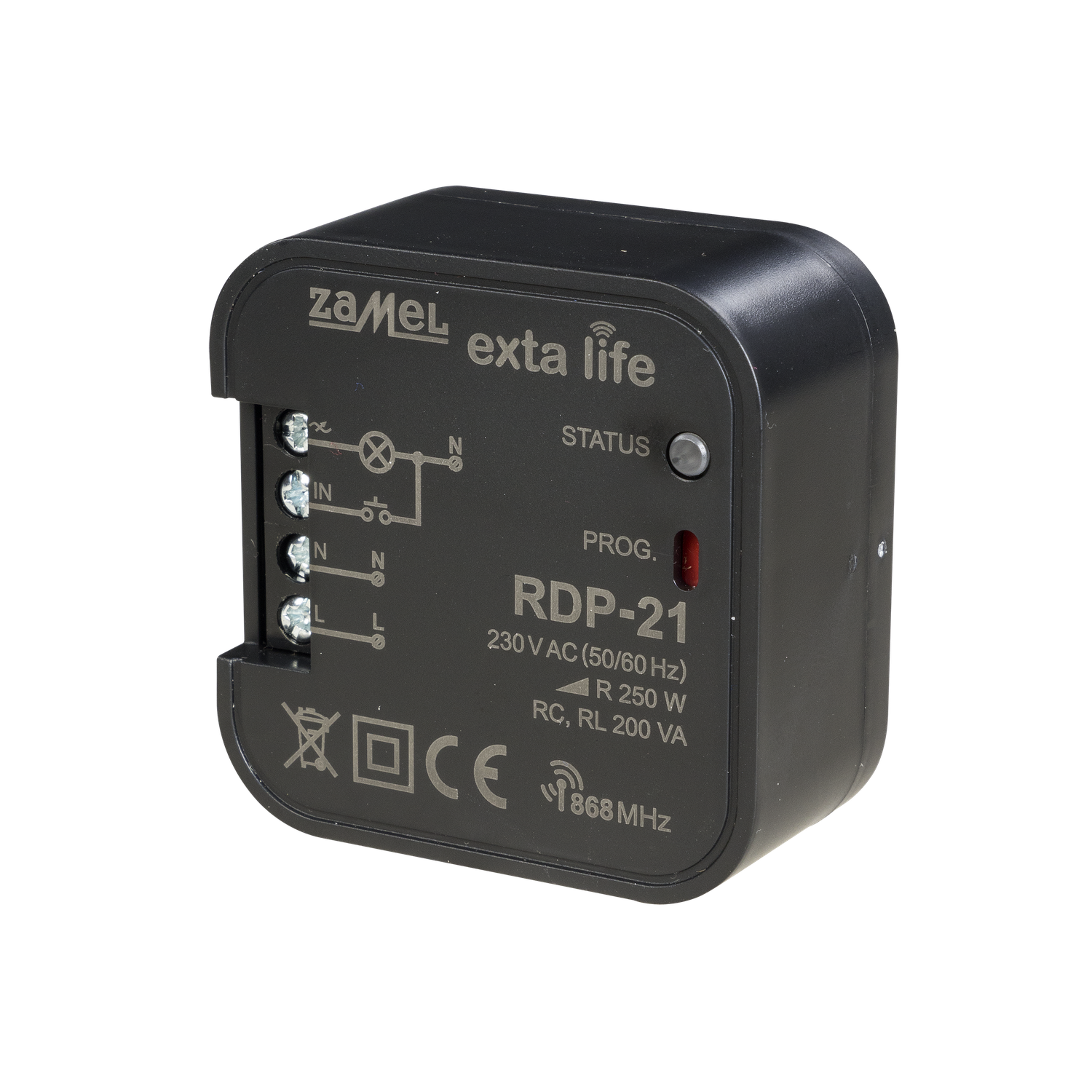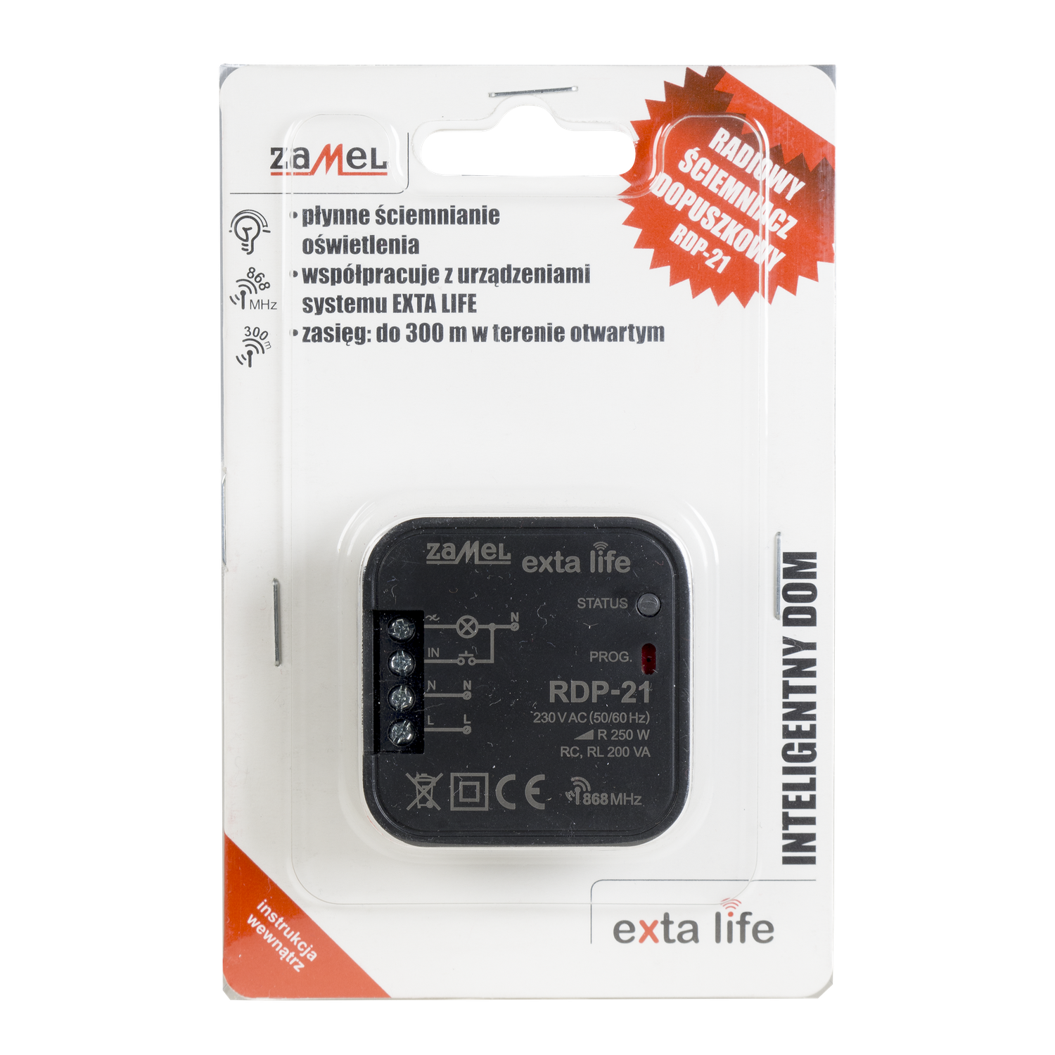 RDP-21 Dimmer kann man mit traditionellen Glühbirnen, Halogenleuchten oder mit Leuchten, die durch elektrischen Transformator versorgt werden, verwenden. Man kann es kabellos mit Sender und EXTA LIFE Controller benutzen oder mit Kabel mit einem monostabilen oder bistabilen Schalter. Für traditionelle Steuerung benutzt man den IN-Eingang. Dank bidirektionaler Kommunikation kann man den aktuellen Status vom Dimmer beobachten (ON/OFF Status + Helligkeit in %) Ausser Controller RDP-01 kann auch durch Sender aus der EXTA LIFE System gesteuert werden. An einen Empfänger kann man mehrere Sender einprogrammieren. Geignet für Montage in UP-Dosen. Software wird automatisch aktualisiert. Programmierung von Zeit des Dimmen oder Einstellung von minimaler und maximaler Helligkeit erweitert die Funktionalität des Dimmers.