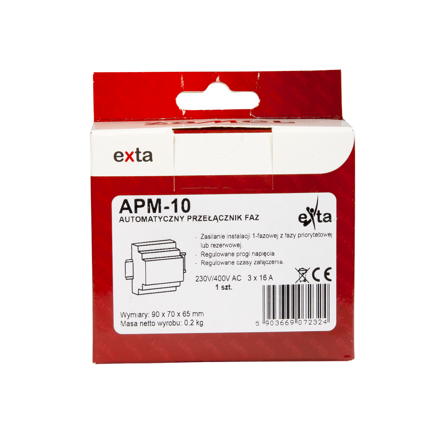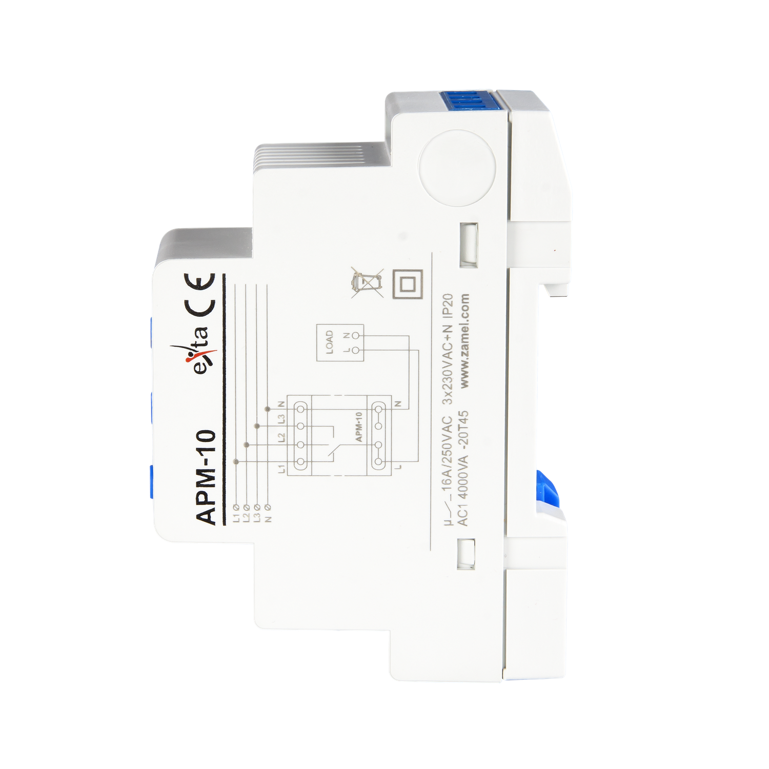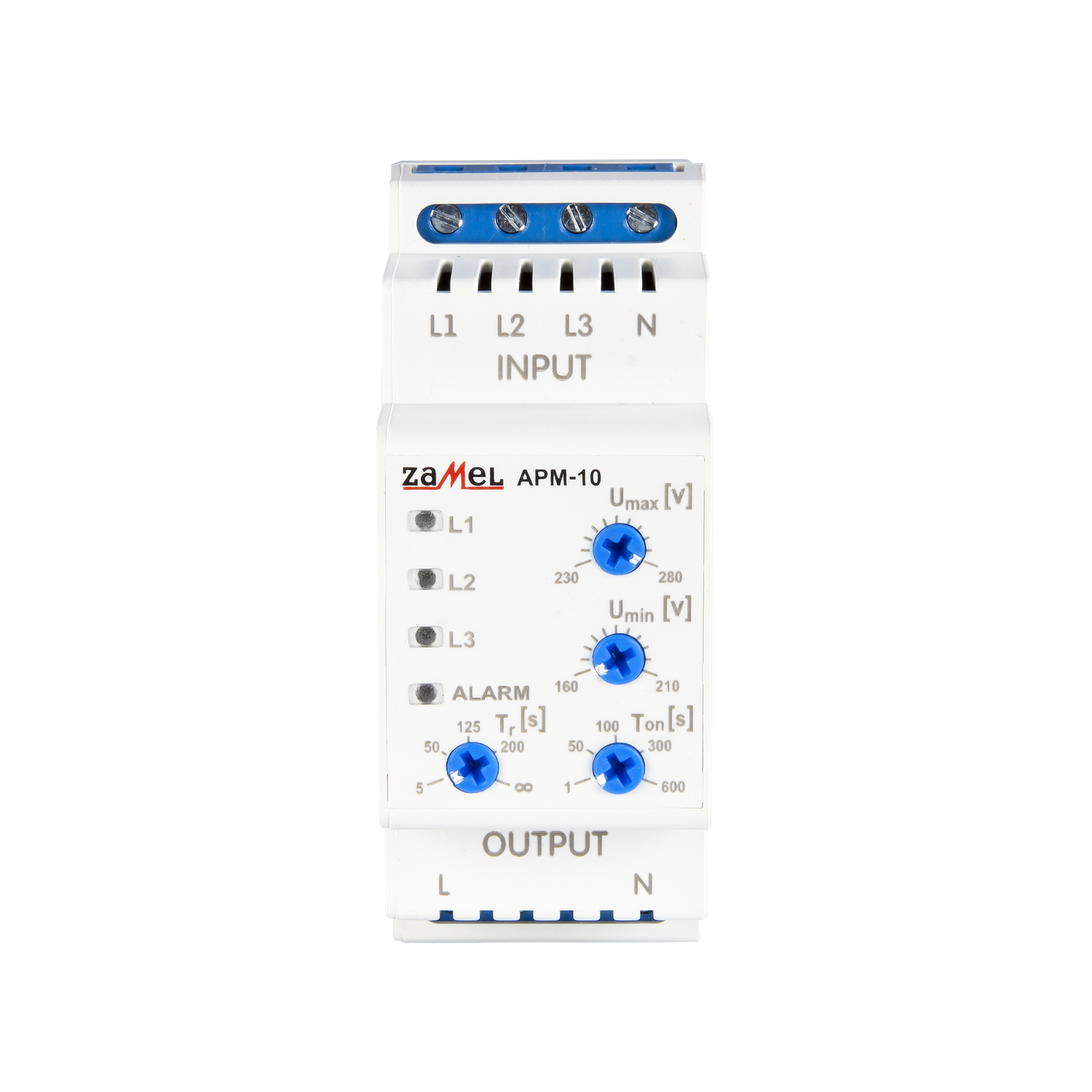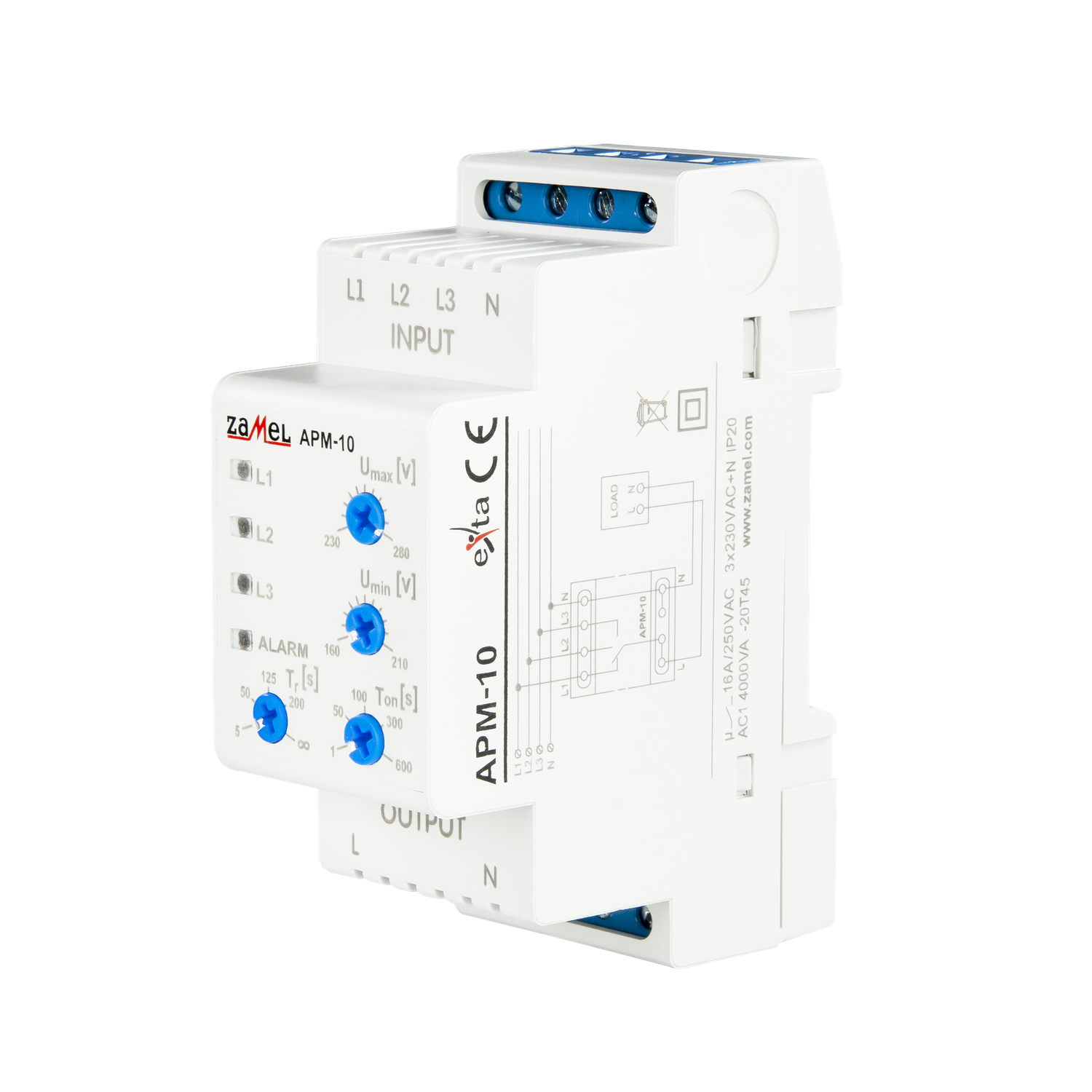 Der universelle automatische Phasenumschalter dient zur Versorgung einphasiger Industrie- und Hausinstallationen mit 230 V / 50 Hz aus einem dreiphasigen 4-Leiter-3x400 + N-Netz zur störungsfreien Versorgung einer einphasigen elektrischen Installation und zum Schutz vor unzulässigen Spannungsschwankungen im Netz. APM-10 wählt automatisch die Phase mit den besten Parametern aus und schaltet auf diese einphasige Last mit beliebiger Leistung um: ● wenn die Leistung 3,5 kW (16 A) nicht überschreitet, Die Last wird direkt eingespeist mit APM-10; ● wenn die Leistung 3,5 kW (16 A) überschreitet, Phasenschalter steuert Schützspulen extern mit ausreichender Leistung. Minimale und maximale Spannungsebenen werden vom Benutzer eingestellt.