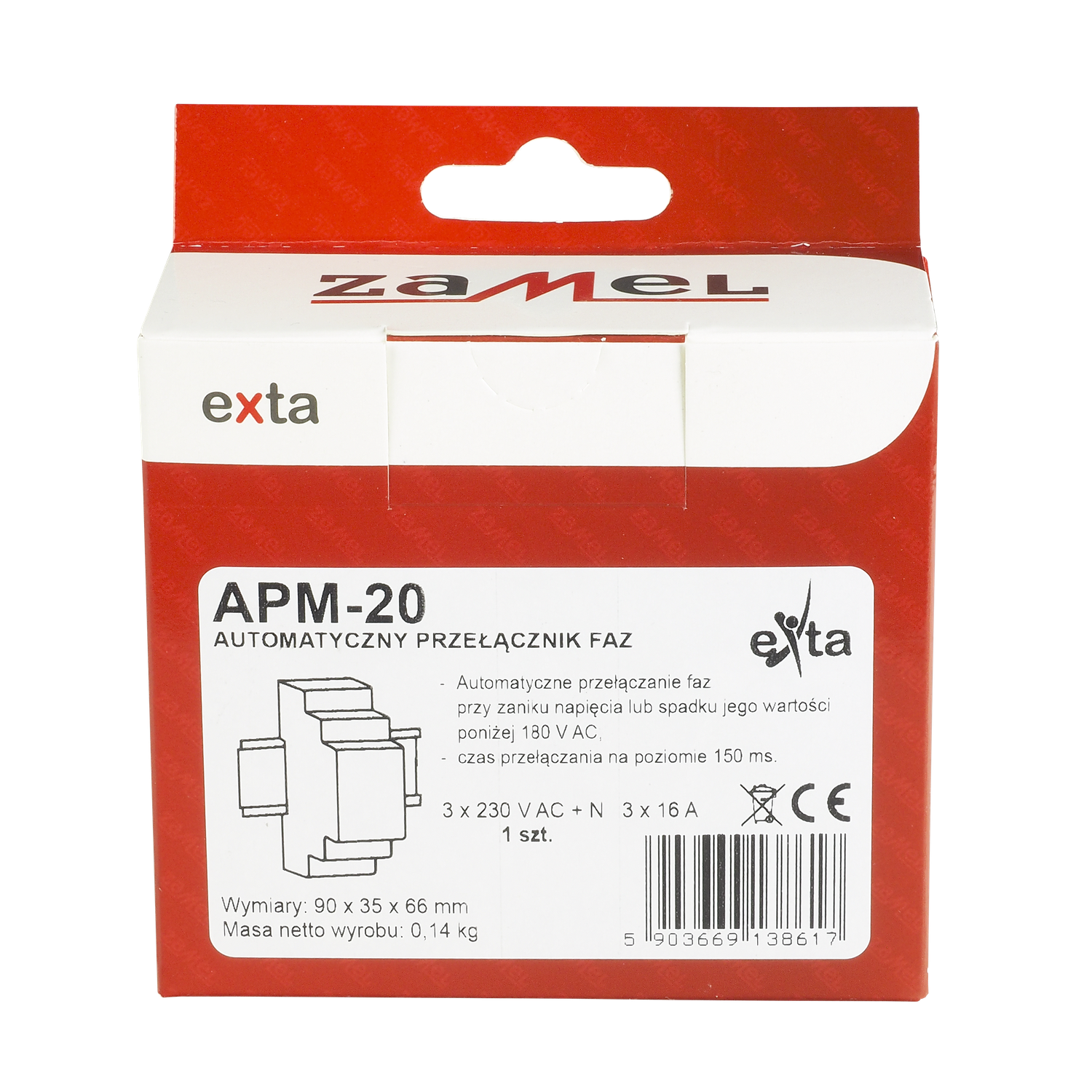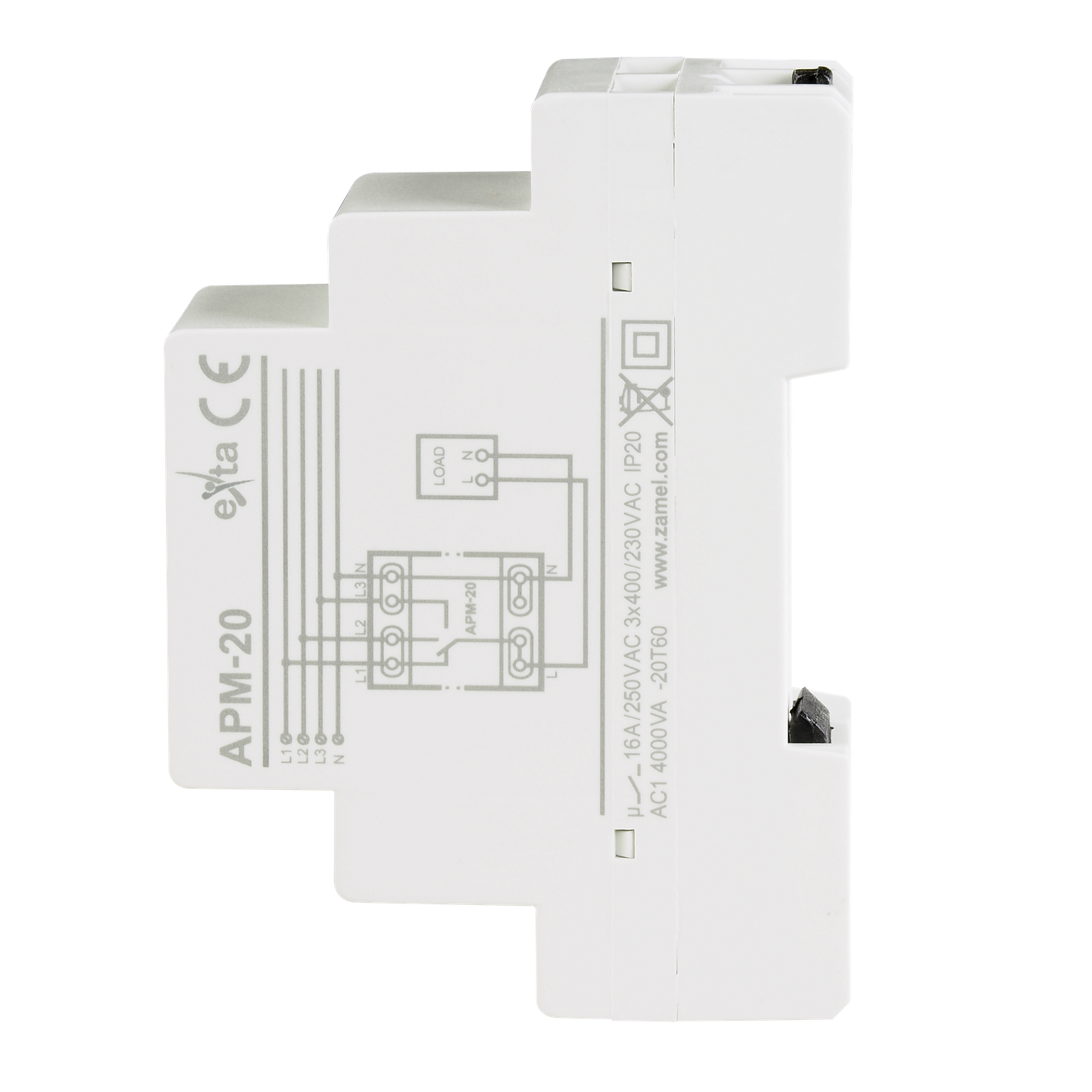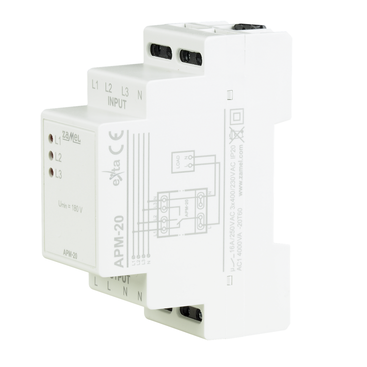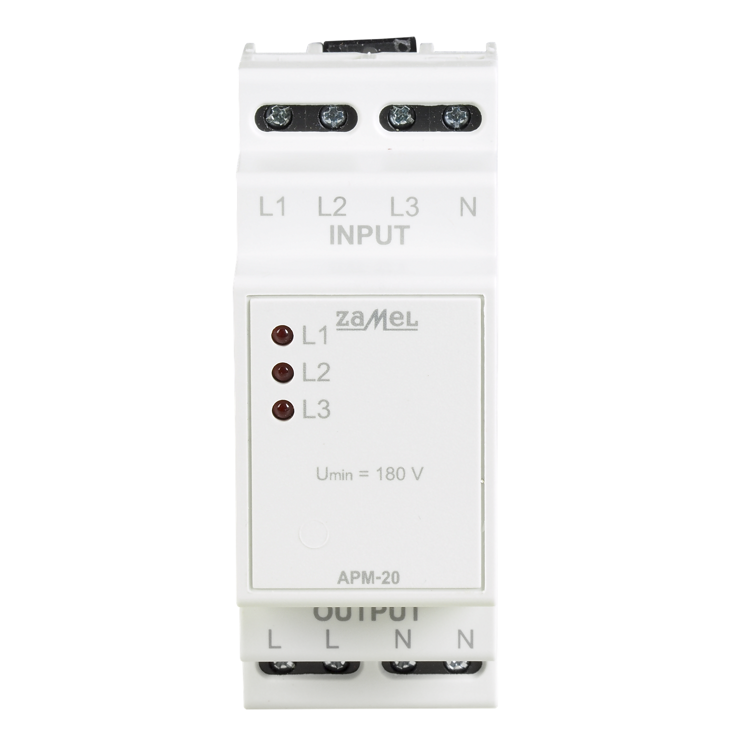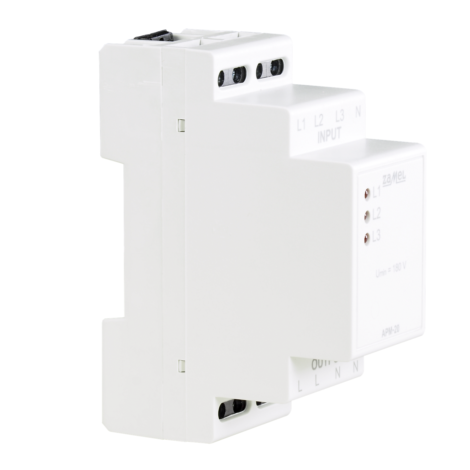 Automatischer Phasenumschalter APM-20 ist ein Gerät, dessen Hauptaufgabe ist, die Stromkontinuität in Einphasenempfänger aufrechtzuerhalten im Moment von Phasenverlust oder RMS-Spannung unter dem Normalwert. Der Hauptvorteil des Gerätes ist ein kleiner Spannungsmessfehler - nicht mehr als 1% auch für stark verzerrte Wellenformen. Dies wurde dank der Software-Implementierung des True-Wandlers erreicht. Das APM-20-Gerät wird mit Strom versorgt aus drei Phasen L1, L2, L3 wobei Phase L1 ist die Prioritätsphase. Spannungsschwelle Schalten (180 V AC), Schaltzeit Schalten (150 ms) und Spannungshysterese (10 V AC) sind werkseitig eingestellt ohne die Möglichkeit, vom Benutzer geändert zu werden. LEDs an der Vorderseite zeigen die jeweiligen Parameter optisch an. Die interne Anordnung der Ausgangskontakte bietet einen erhöhten Schutz gegen Verklebung und Schtz vor Phase-zu-Phase-Kurzschluss. Maximale Ausgangsbelastung beträgt 16 A für Empfänger der AC1 Klasse. APM-20 ist für Einbau auf DIN-Schienen geeignet. Das Gehäuse hat die Breite von 2 Modulen.