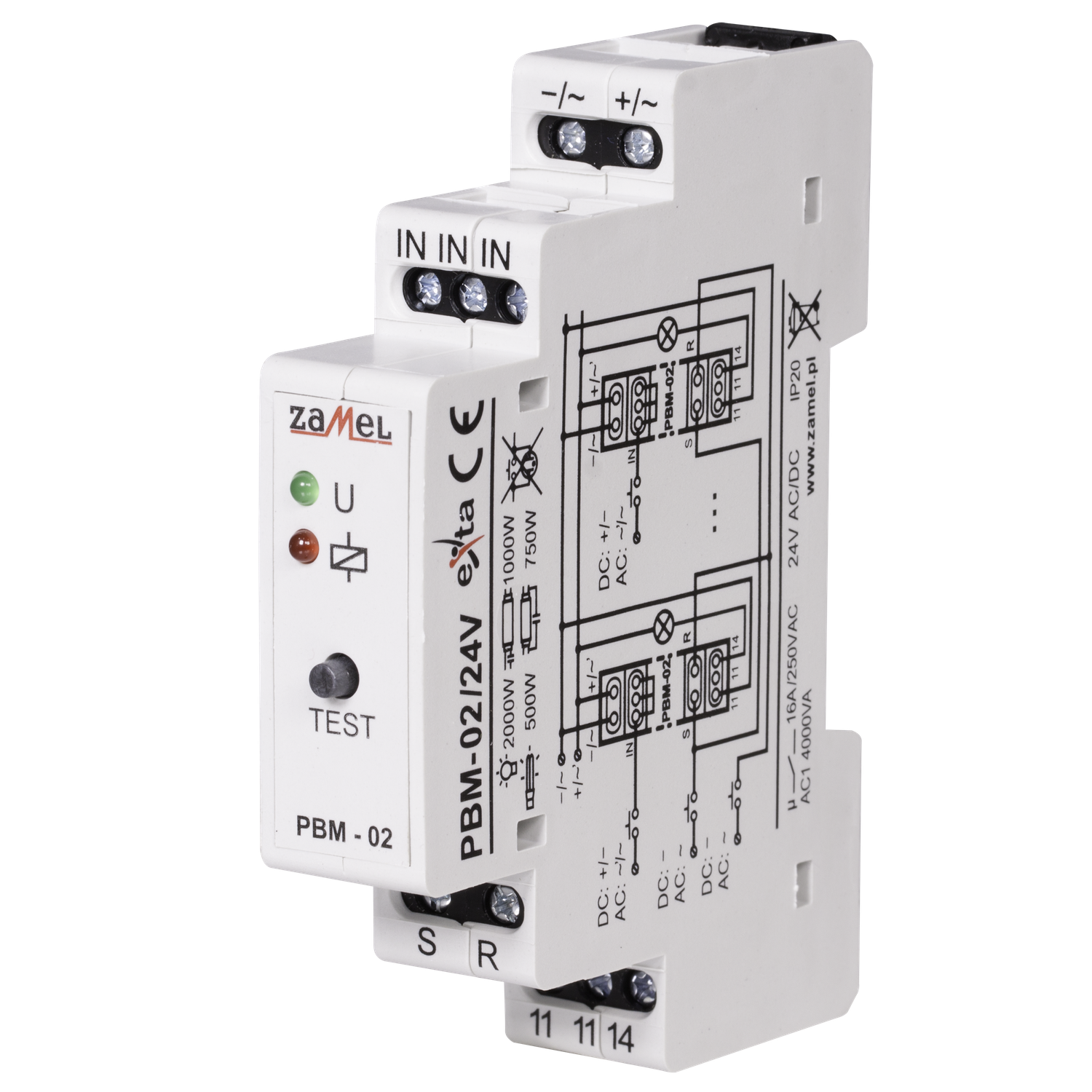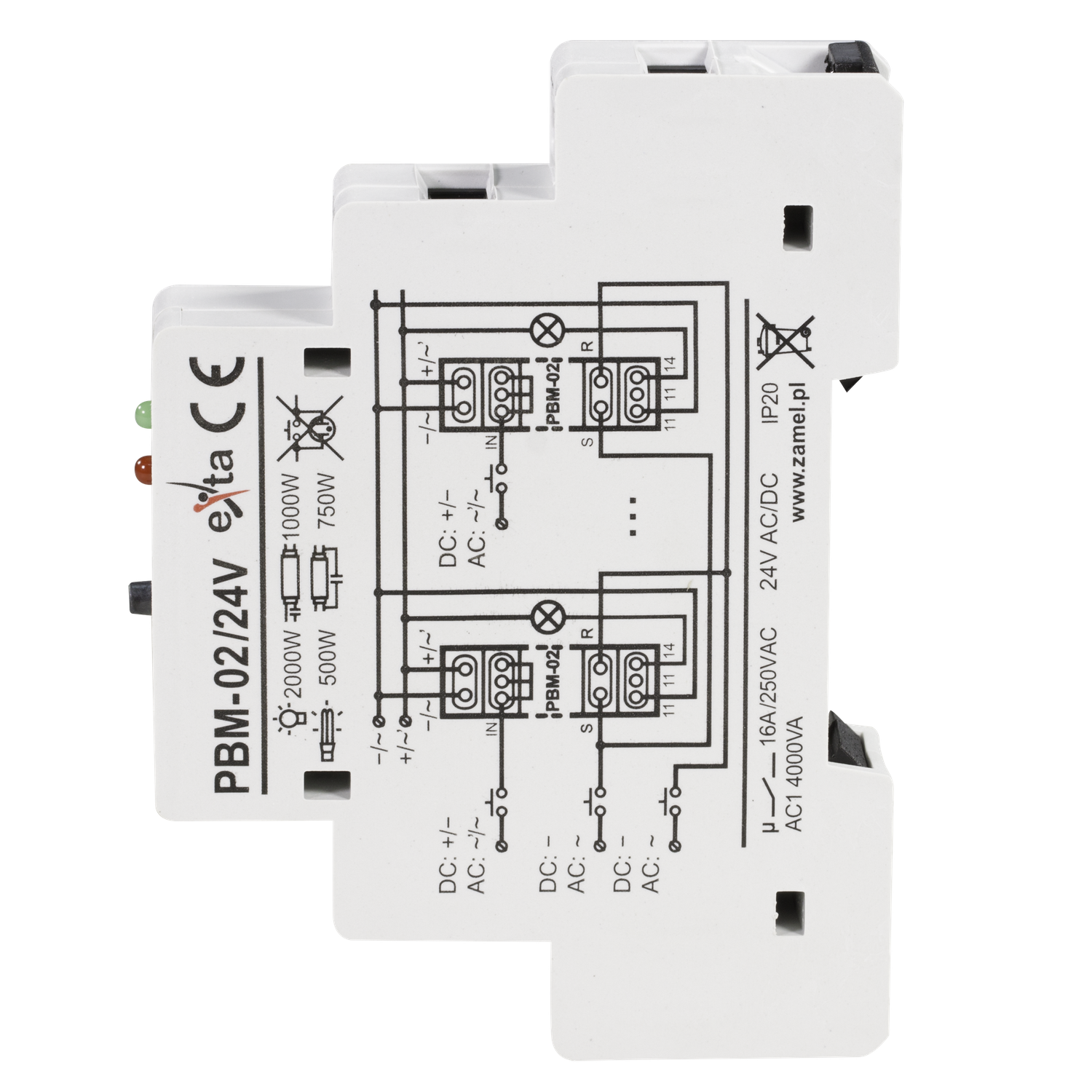 Das bistabile Relais PBM-02/24V dient zur Steuerung der Beleuchtung oder anderer Geräte über parallel geschaltete unipolare Taster. Das anschließende Drücken einer beliebigen Taste bewirkt das Aktivieren oder Deaktivieren von Geräten, die an die Ausgangsanschlüsse angeschlossen sind. Die Steuereingänge Set und Reset ermöglichen die zentrale Steuerung einer Gruppe von Relais. Der Steuerimpuls für den Eingang IN kann das Signal von der Leitung L oder N und die Eingänge S und R nur von der Leitung L sein.Die Verwendung des internen Speichers im bistabilen Relais ermöglicht es Ihnen, sich bei einem Stromausfall an seinen aktuellen Zustand zu erinnern.