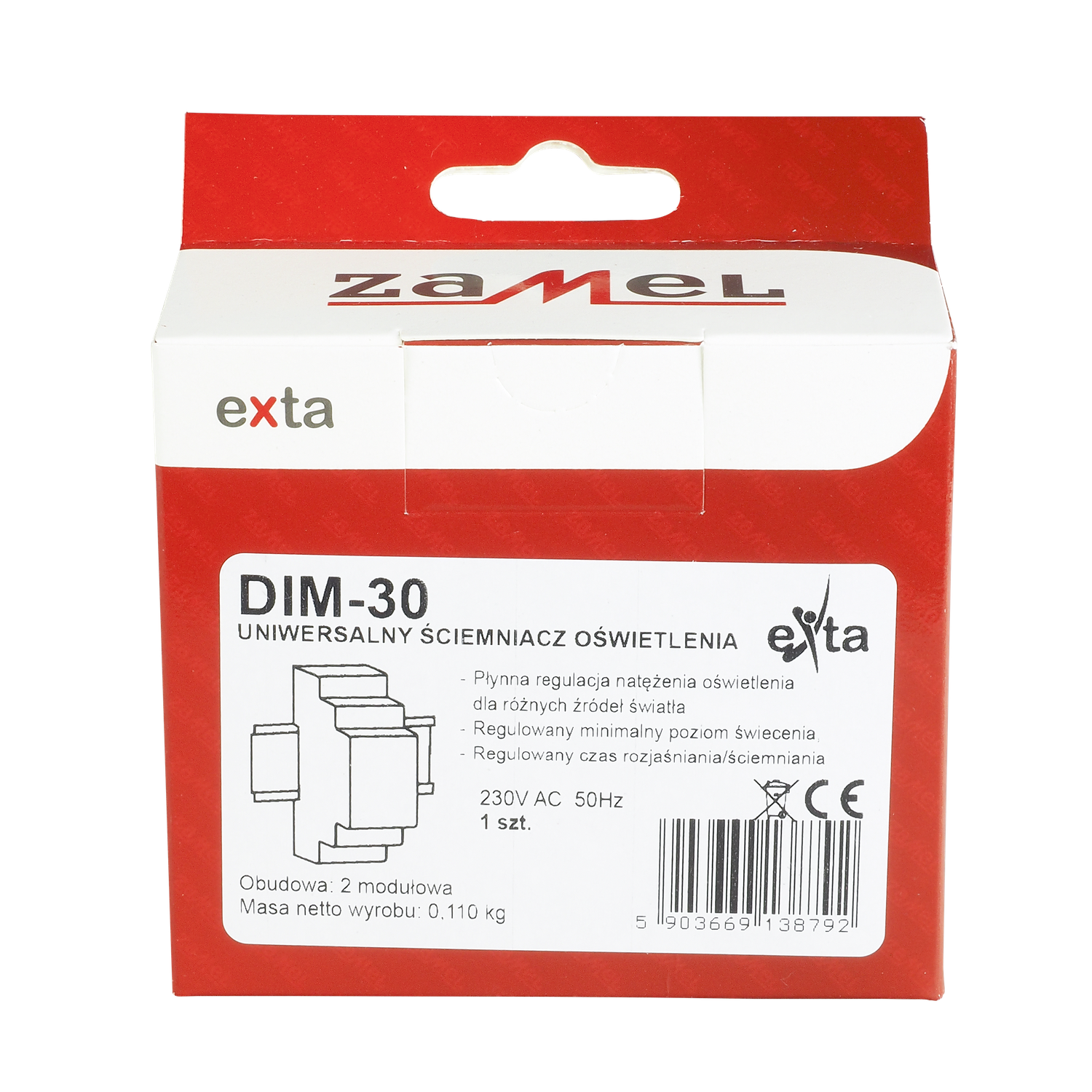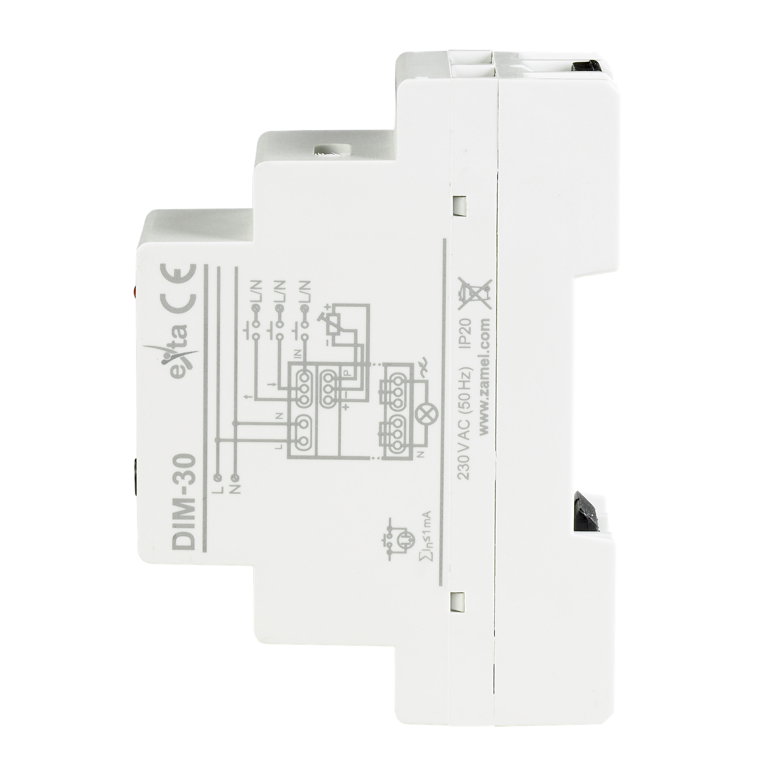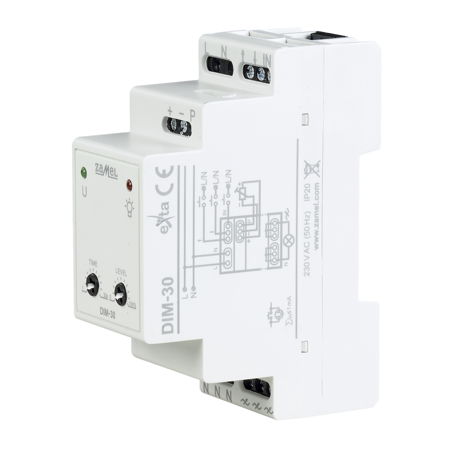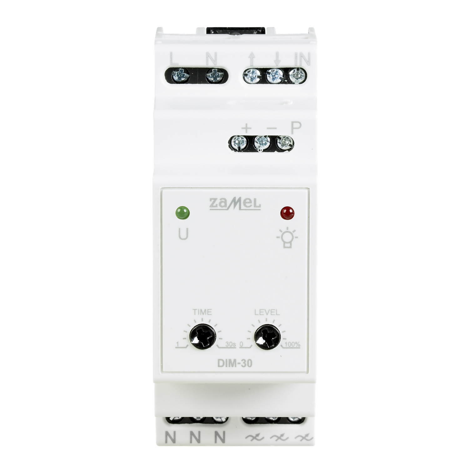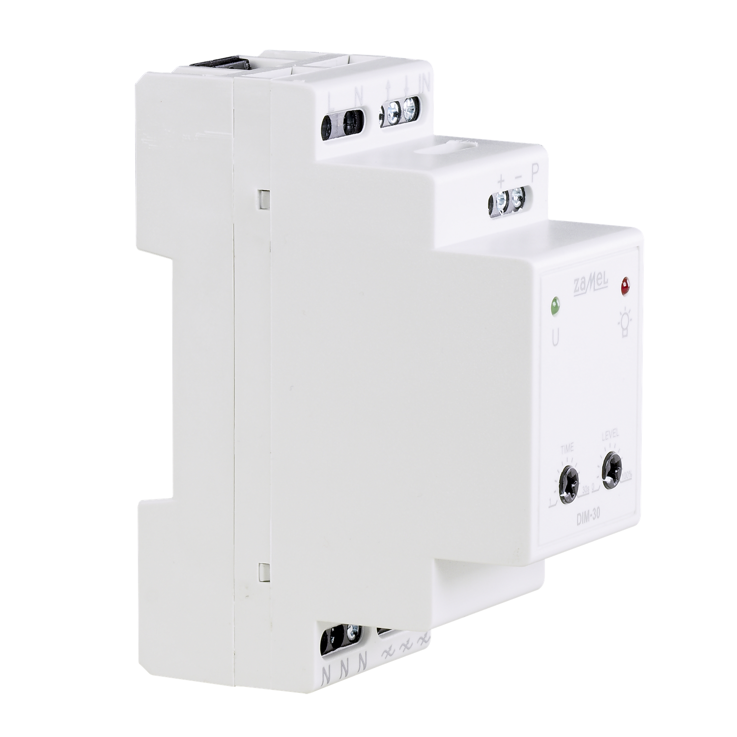 Der DIM-30 Dimmer ermöglicht aufgrund der verwendeten Hard- und Softwarelösungen eine stufenlose Anpassung der Beleuchtungsstärke für verschiedene Lichtquellen. Funktioniert mit konventionellen Glühlampen und Halogenlampen mit 230 V Wechselstrom, Lichtquellen, die von elektronischen- und Ringkerntransformatoren versorgt werden, ausgewählten dimmbaren LED-Lampen und dimmbaren Kompaktleuchtstofflampen. Die Wahl des Lasttyps, die Einstellung des minimalen Ausgangsspannungspegels und die Aufhellungs- / Dimmzeiten vereinfachen die Konfiguration und gewährleisten eine größere Kompatibilität als bei Verwendung typischer Lichtdimmer. Zur Ansteuerung können Sie beleuchtete monostabile Schalter (Taster): einzeln und doppelt; Potentiometer 1 ÷ 10 V und andere Automatisierungssysteme mit Ausgängen im Standard 1 ÷ 10 V verwenden. Der Dimmerausgang verfügt über Kurzschluss-, Überlast- und Wärmeschutz, was einen langen und zuverlässigen Betrieb garantiert.
