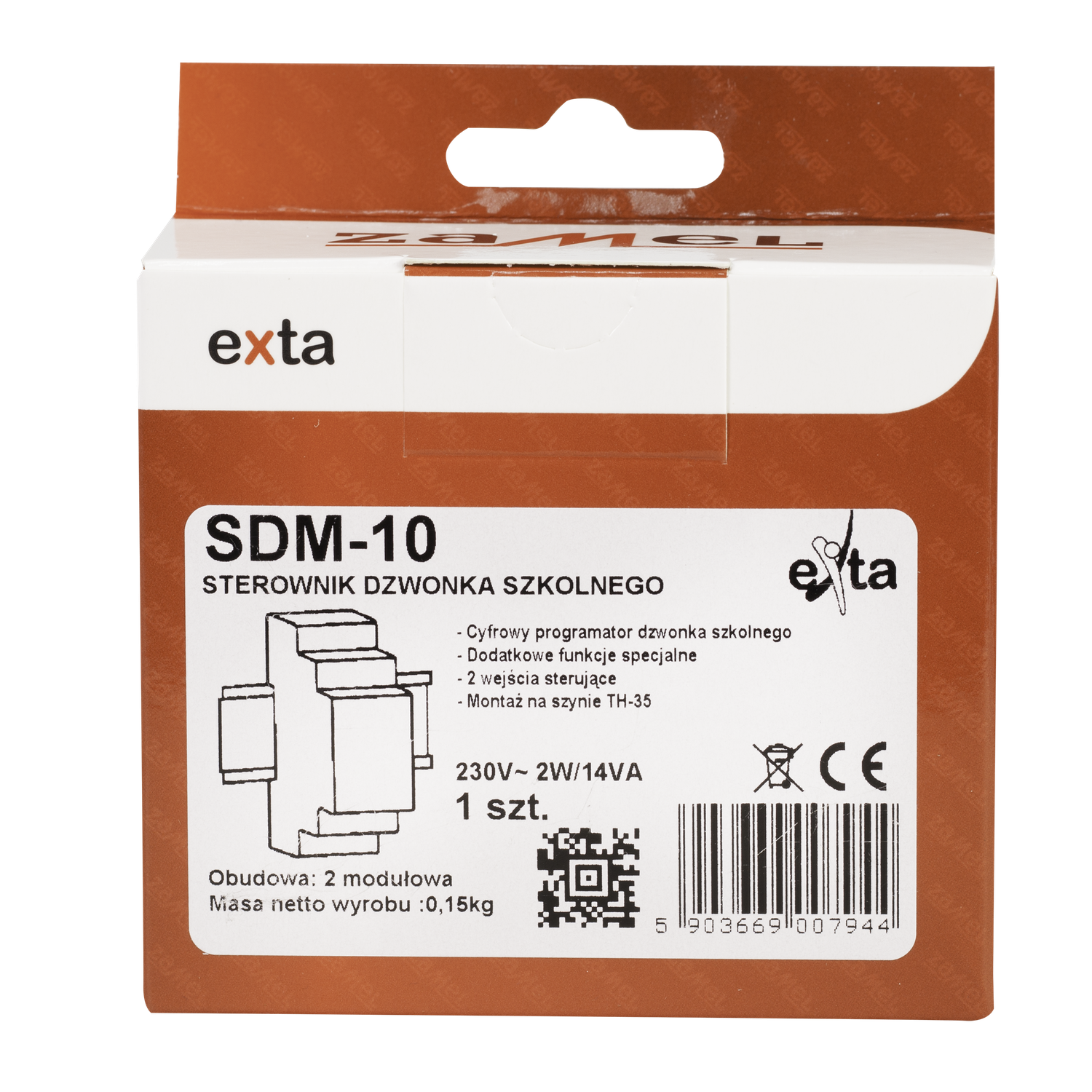 Der Schulglockecontroller SDM-10 dient zur Steuerung der in Schulen verwendeten akustischen Signalisierung unter Verwendung von Schulgongs (z. B. DNT-212, DNS-212, DNT-212M, DNS-212M). Die Steuerung erfolgt automatisch nach dem eingestellten Programm. Das Programm besteht aus der Definition der Unterrichtszeit, der Länge der folgenden Pausen und der Startzeit. Das Gerät ist bereit, spezielle Funktionen (Alarmglocken, kurze Lektionen) über programmierbare Eingänge auszuführen. Die Klingelsteuerung kann einbaufertig als Electronic Janitor (EW-01) vorbereitet werden. Das Design des Systems garantiert eine Batteriesicherung aller Einstellungen bei fehlender Stromversorgung.