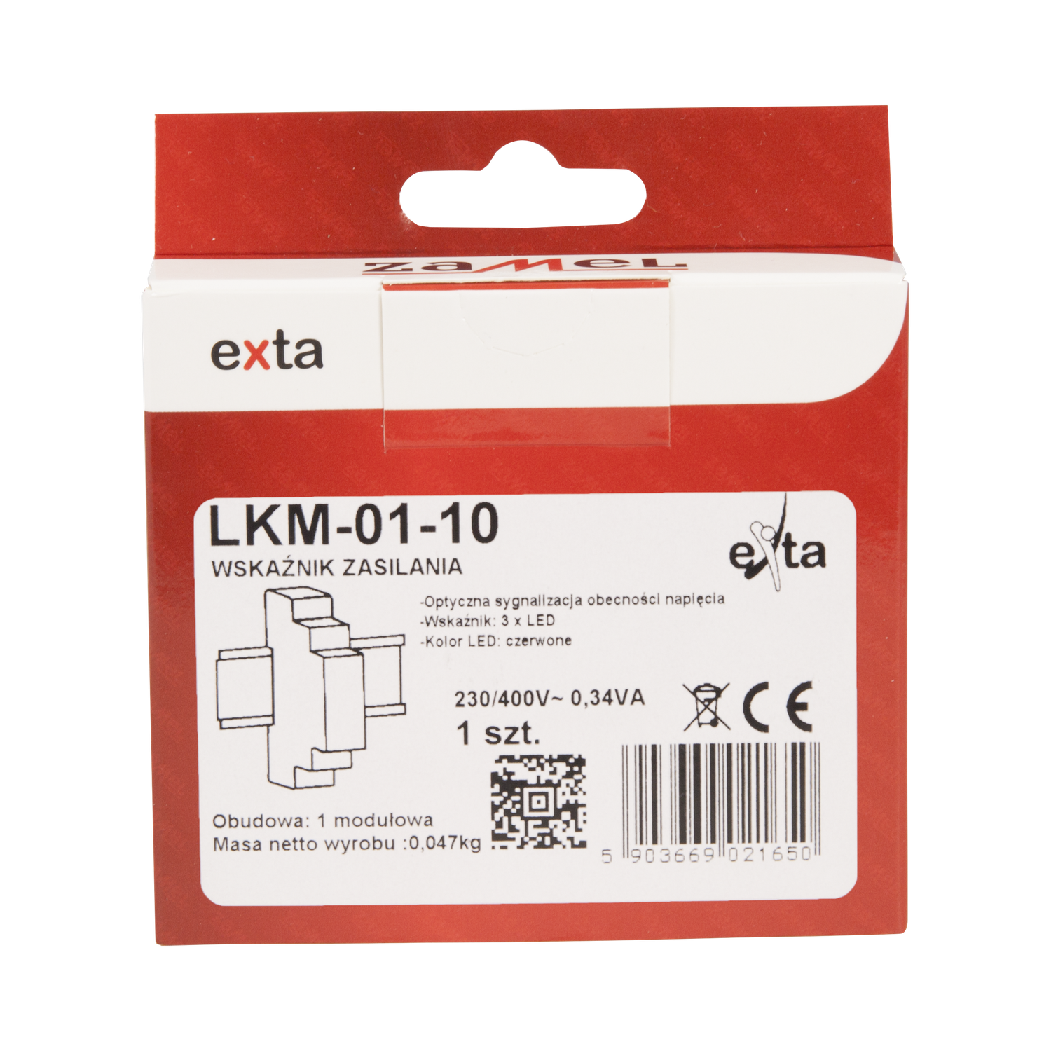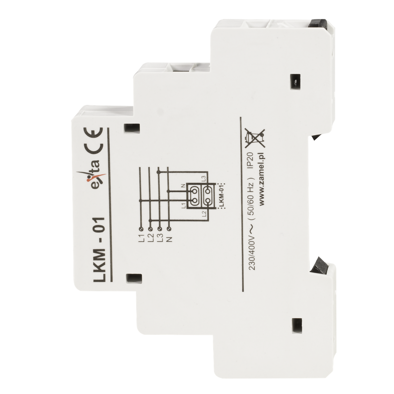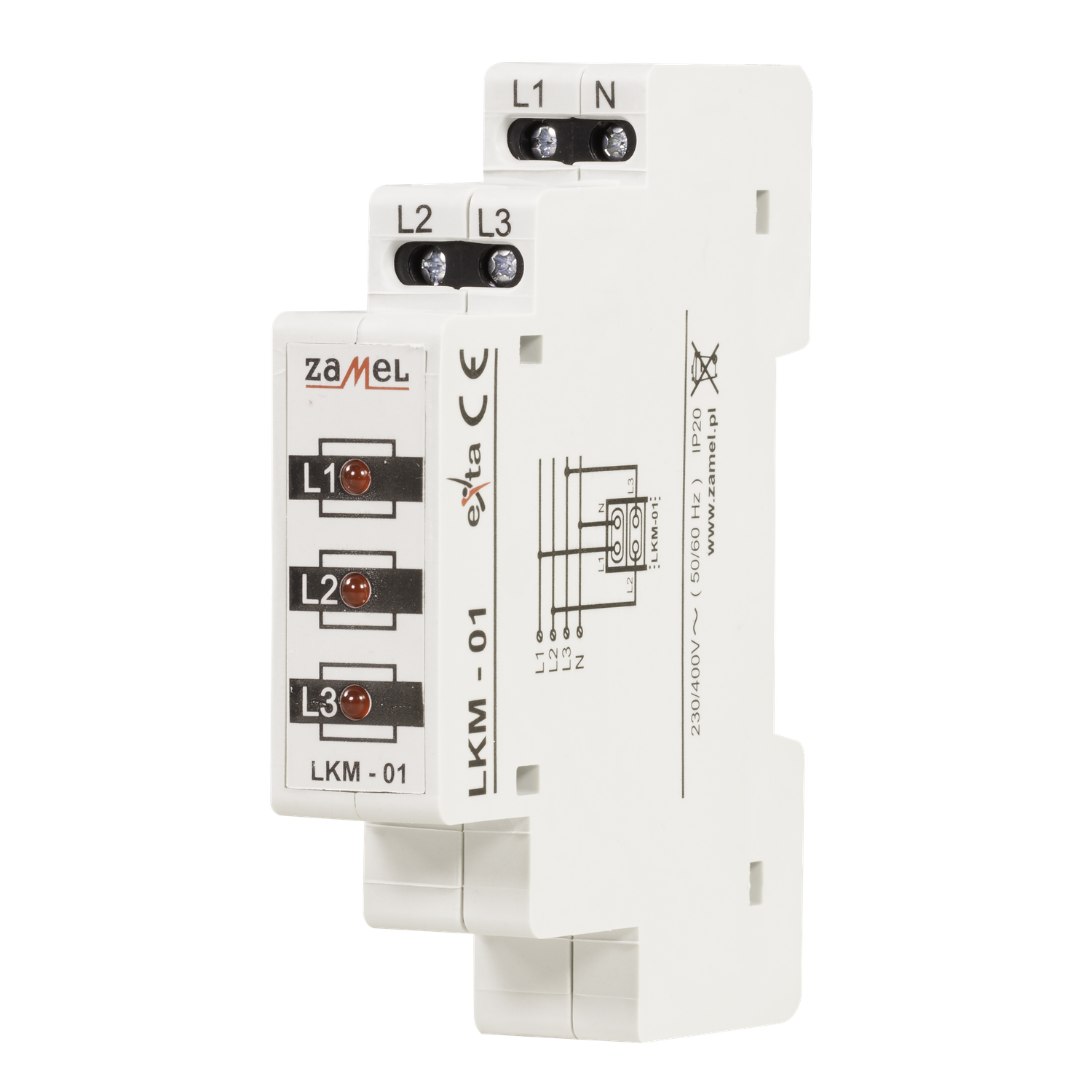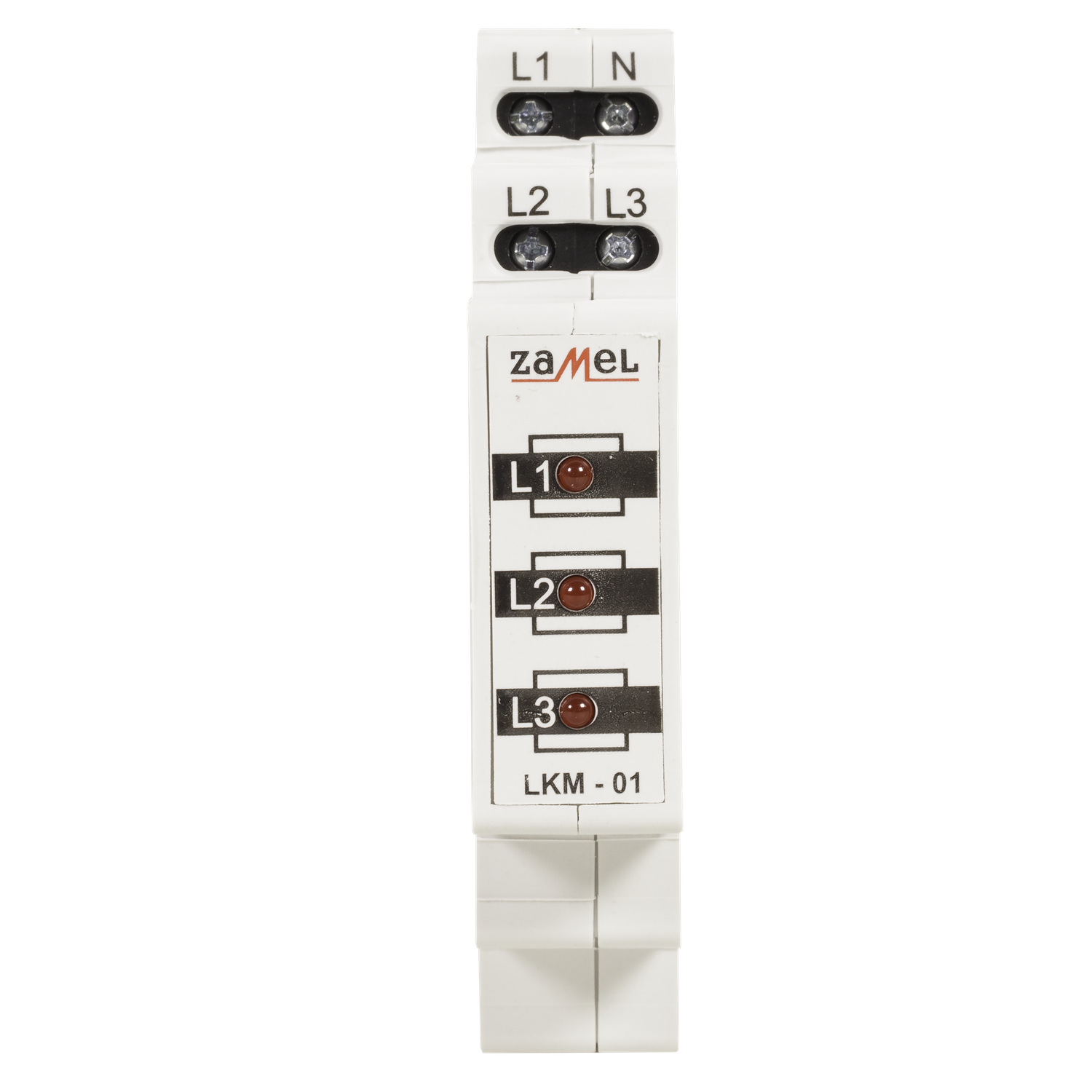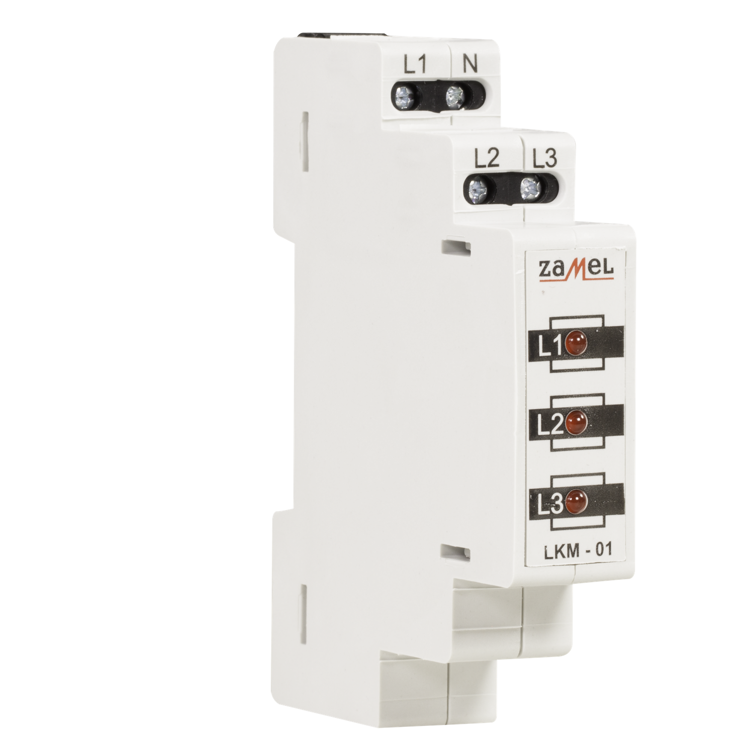Spannungsanzeiger LKM-01 dient als Spannungsanzeige in Dreiphasen-Netz. Dies erfolgt über drei LED's: L1, L2, L3. Möglichkeit von 4 LED-Farben: rot, grünn, gelb, gemischt. Installation auf einer Dreiphasen-DIN-Schiene mit Neutralleiter (N-Leiter).