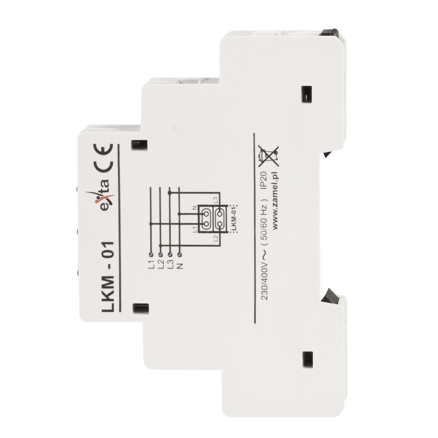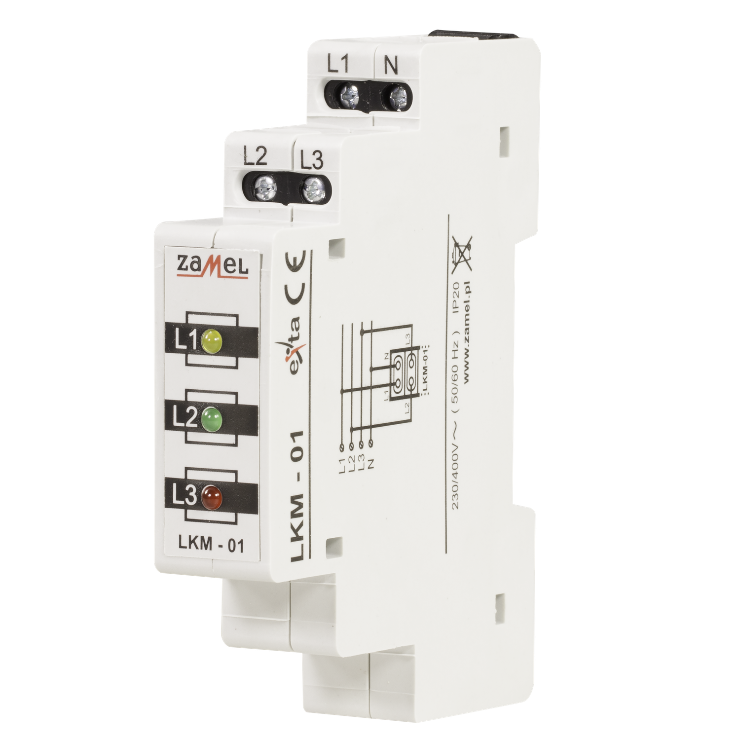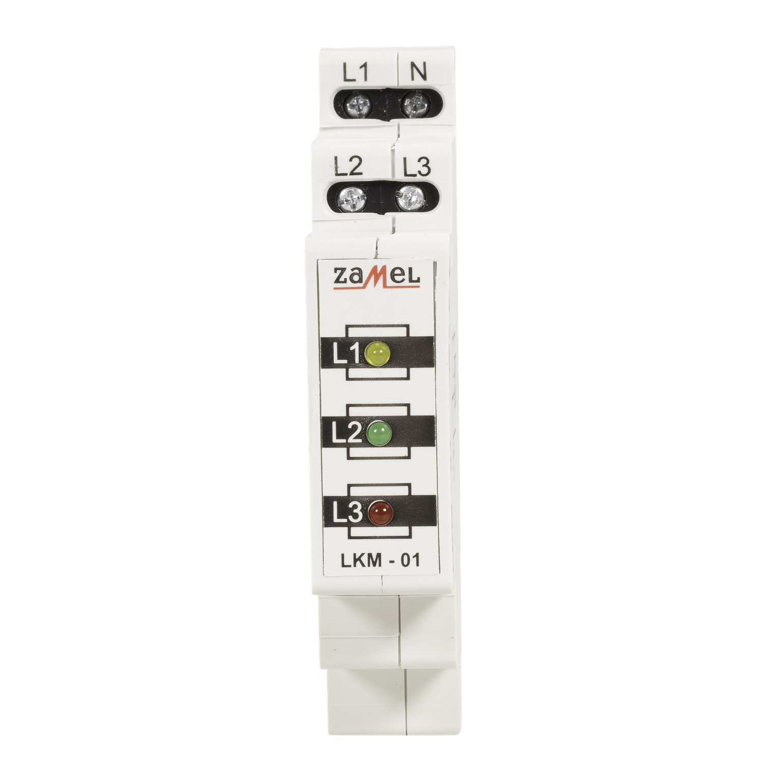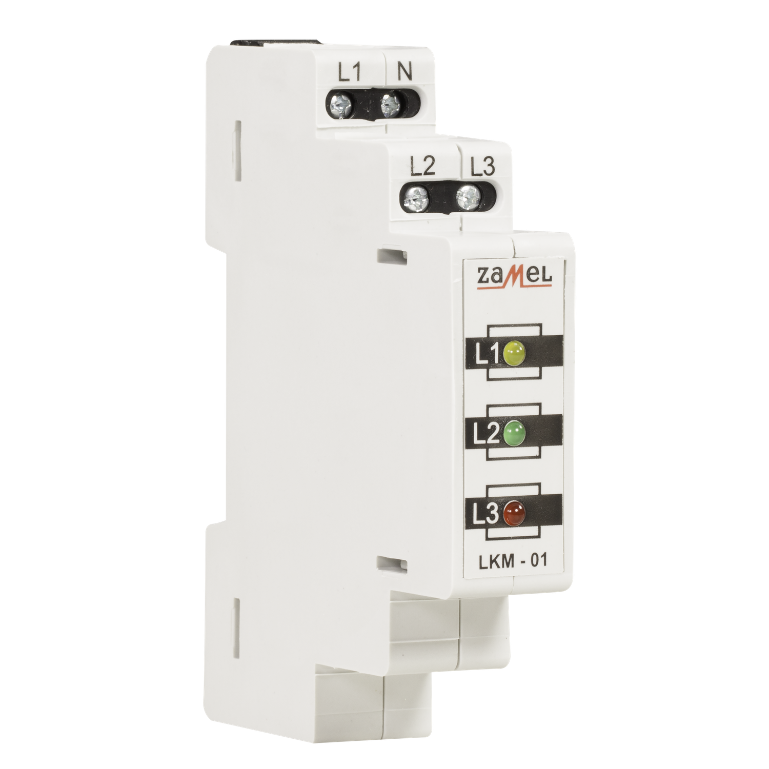 Spannungsanzeiger LKM-01 dient als Spannungsanzeige in Dreiphasen-Netz. Dies erfolgt über drei LED's: L1, L2, L3. Möglichkeit von 4 LED-Farben: rot, grünn, gelb, gemischt. Installation auf einer Dreiphasen-DIN-Schiene mit Neutralleiter (N-Leiter).
