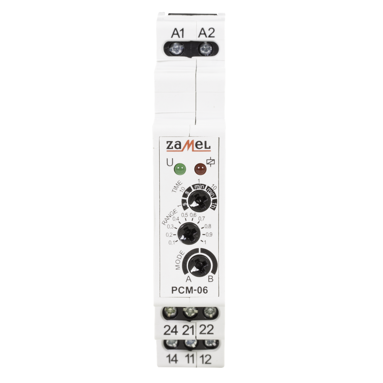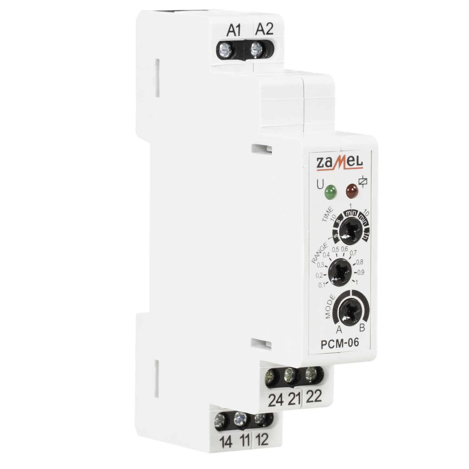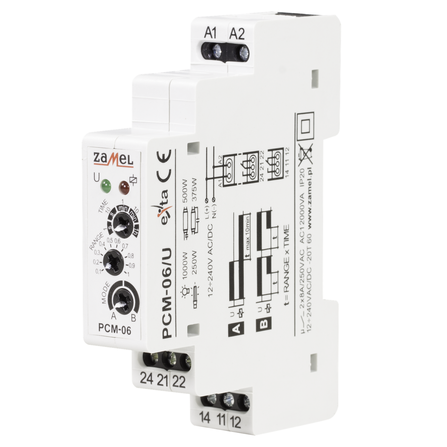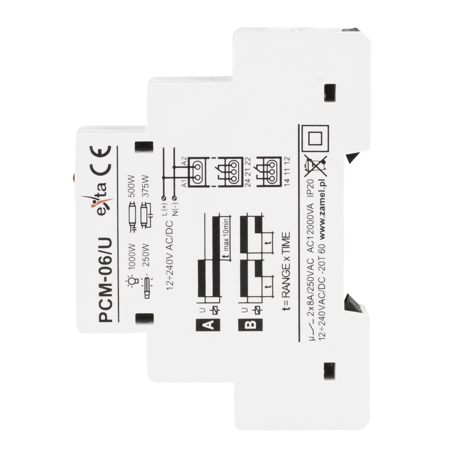 Das Doppelfunktions-Zeitrelais PCM-06 / U übernimmt die Funktionen des verzögerten Ausschaltens (Modus A) und des verzögerten Einschaltens (Modus B). Das Relais wird von einer Versorgungsspannung von 12 ÷ 240 V AC / DC angesteuert. Im A-Modus arbeitet das Relais nach einem Stromausfall bis zu 10 Minuten. Dieser Modus kann beispielsweise zur Steuerung von Badventilatoren verwendet werden. In der Betriebsart B wird das Relais nach Ablauf der eingestellten Zeit t eingeschaltet, weshalb diese Betriebsart beispielsweise zur akustischen Signalisierung des Motorstartmoments verwendet werden kann. Nach dem Signal (mit der Länge t) startet der Motor. Das Gerät wird mit einer Spannung im Bereich von 12 bis 240 V AC / DC betrieben.