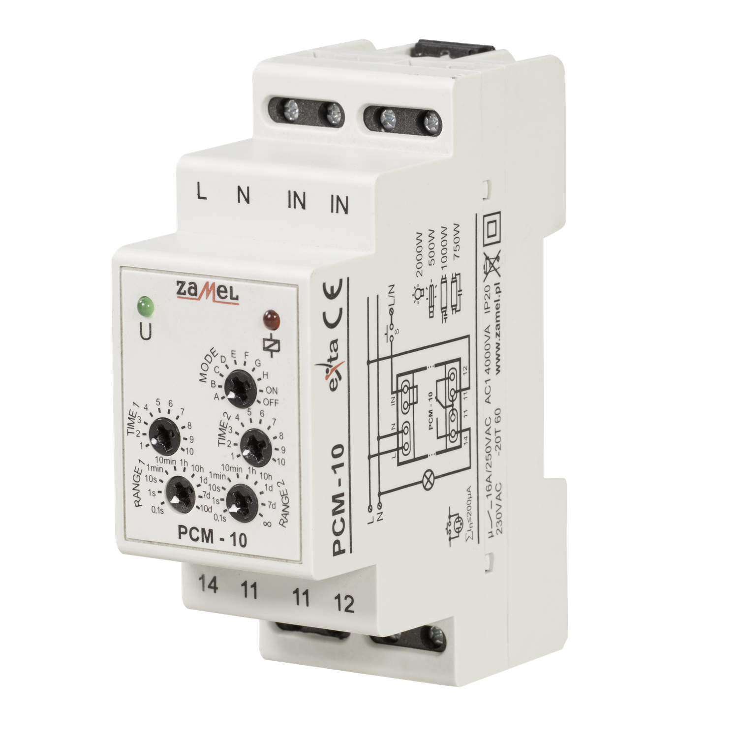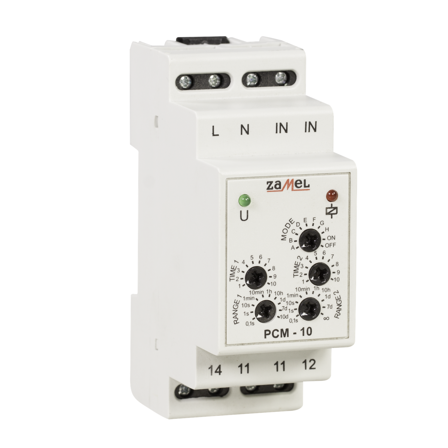 Das multifunktionale Zeitrelais PCM-10 dient zur Ausführung von Zeitfunktionen in Automatisierungs- und Steuerungssystemen. Das Gerät verfügt über 10 unabhängige Betriebsarten, die durch Versorgungsspannung oder einen externen Triggerimpuls (von der L- oder N-Leitung) ausgelöst werden. Es zeichnet sich durch einen sehr weiten Einstellbereich von zwei Zeiten t1 und t2 und Funktionen des konstanten Ein- und Ausschaltens aus. Das Relais ändert ständig die Betriebsarteneinstellungen und -zeiten.