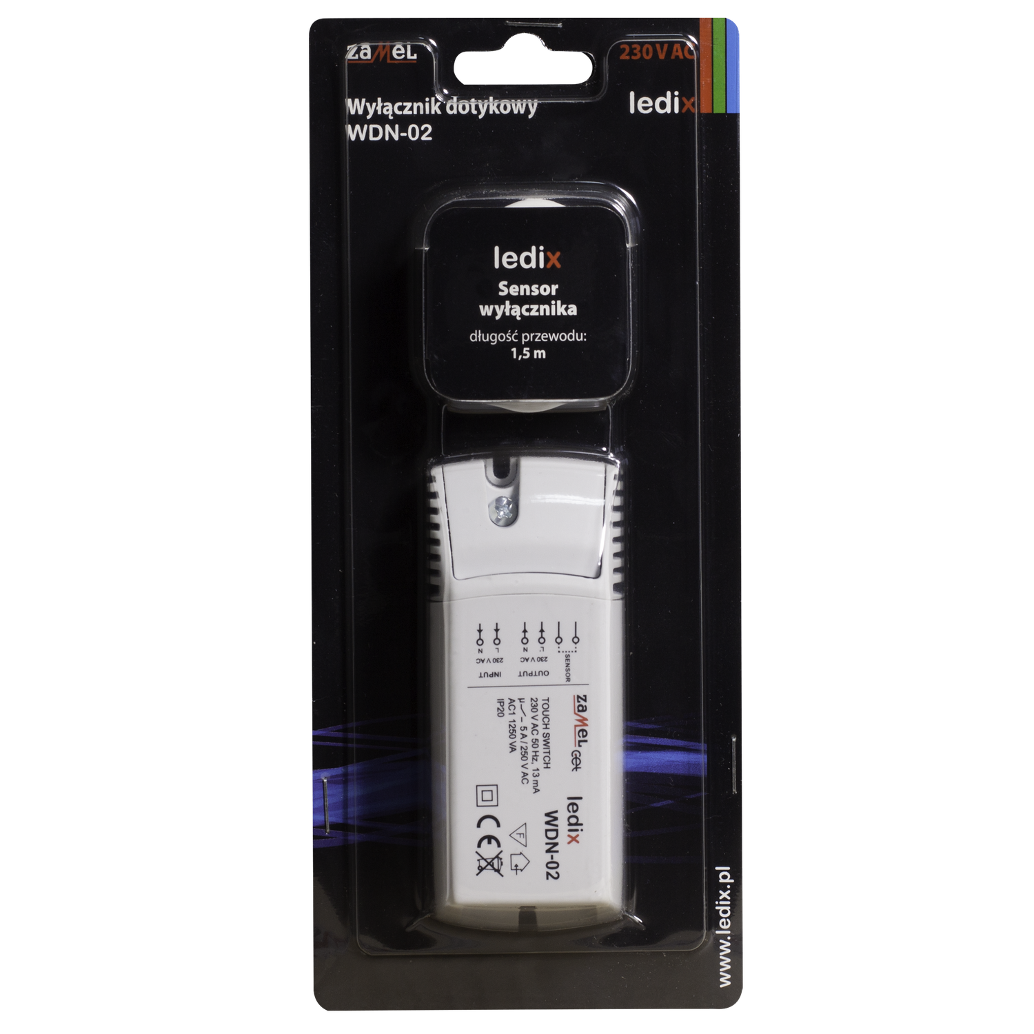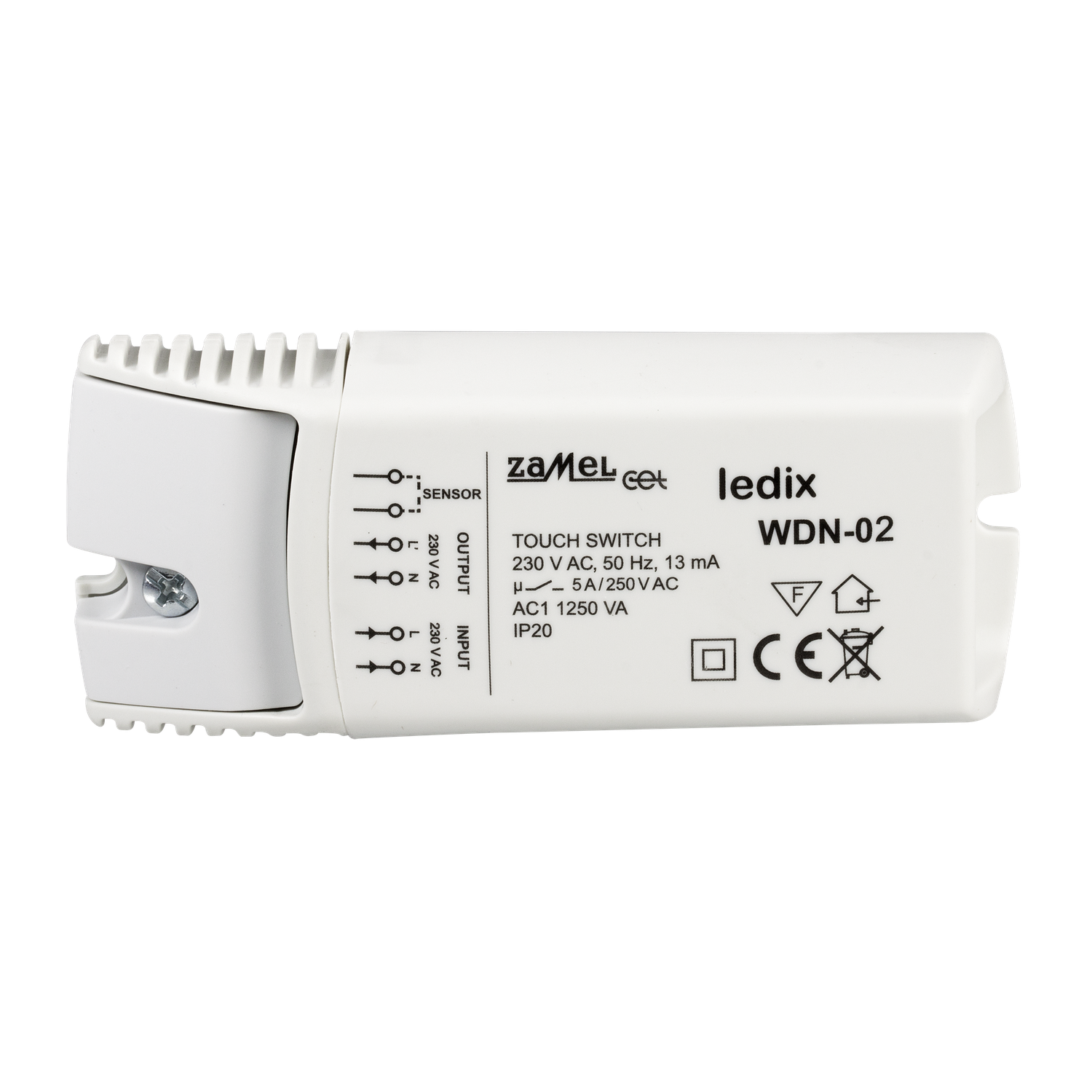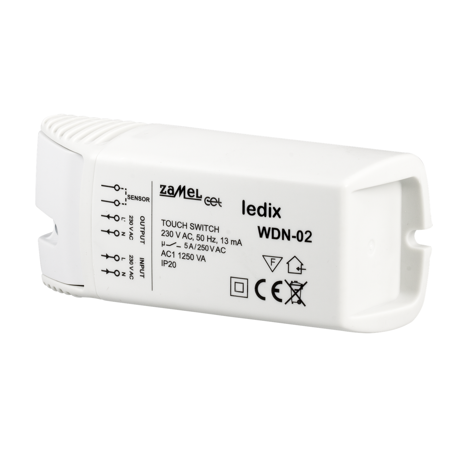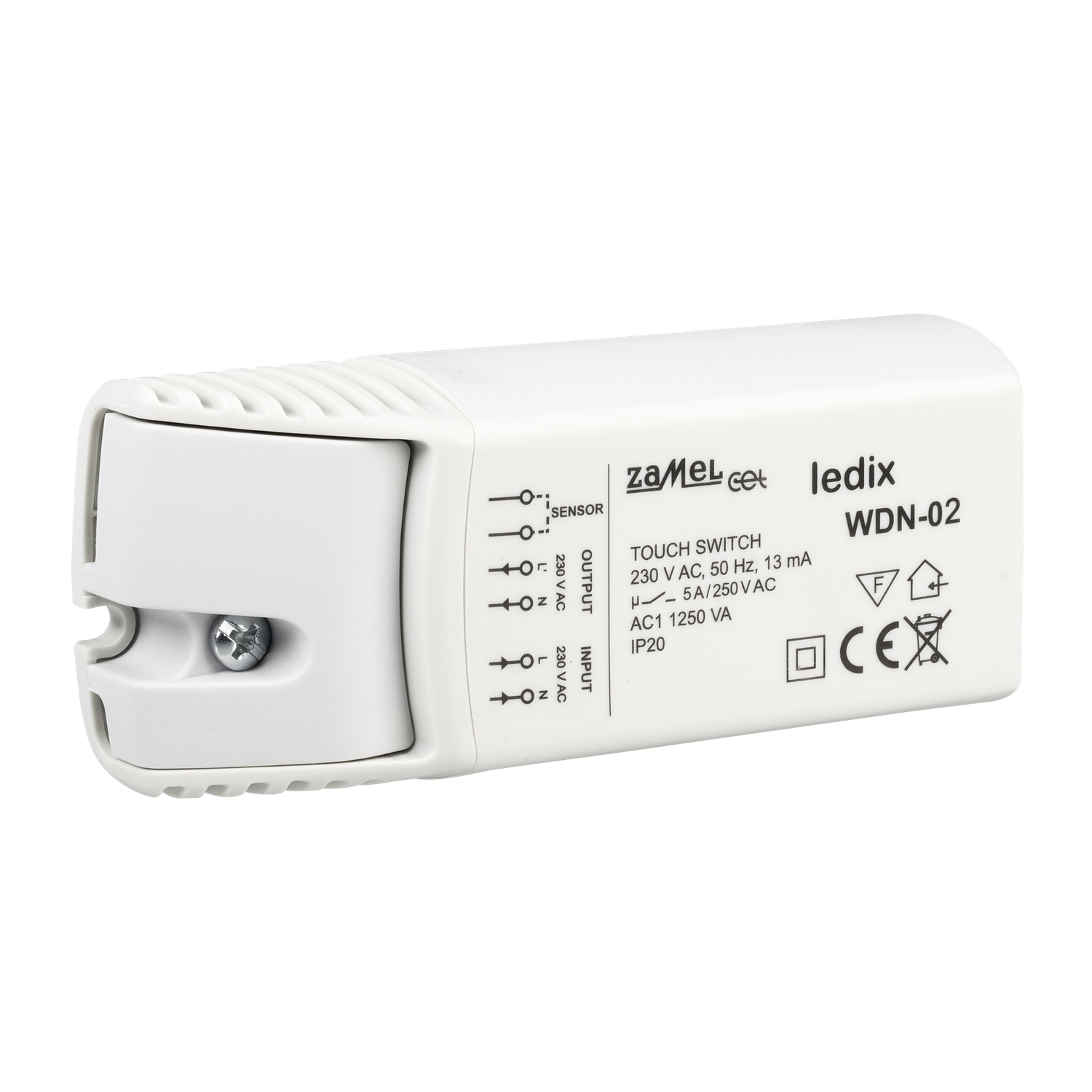 Der Schalter WDN-02 wird dazu verwendet, das Licht mittels eine Berührung ein- und auszuschalten. Der Schalter hat ein Ausgang 230 V AC. Geeignet zur Steuerung von traditionellen Beleuchtung wie z.B. Halogenlampen, Glühbirnen oder LED. In Fall von 12 V AC Leuchten muss man ein Transformator/LED Netzteil anschließen. Das Gerät kann auf brennbaren Materialien, z.B Holz, Möbelbrettern, installiert werden. Das Gerät kann selbst von Personen mit Herzschrittmachern sicher bedient werden.
