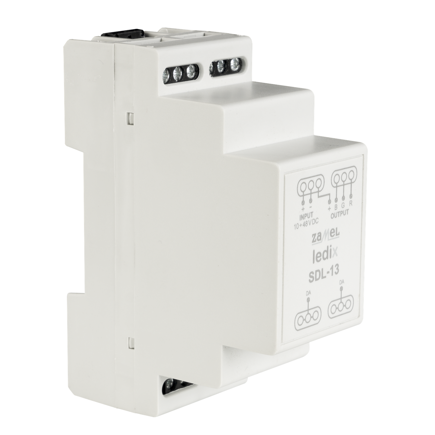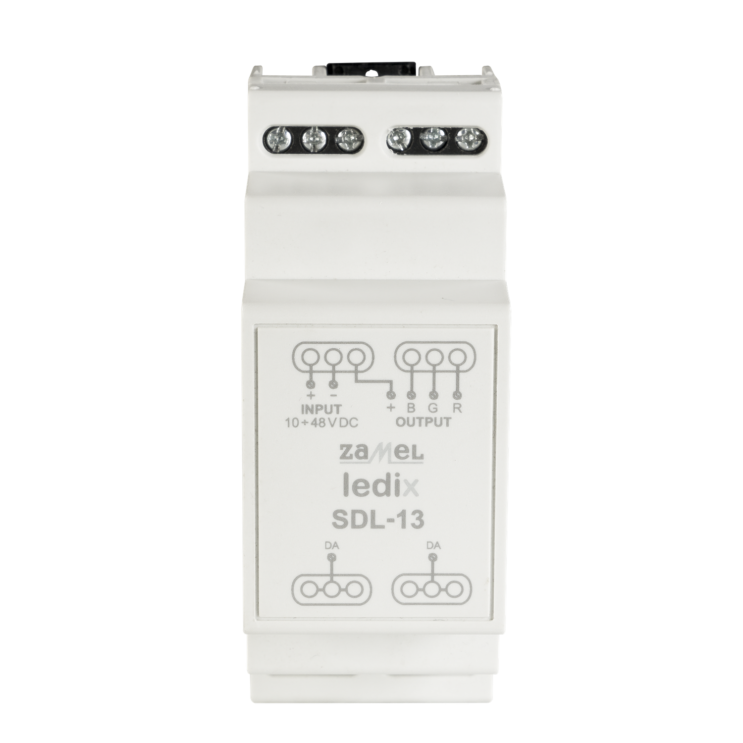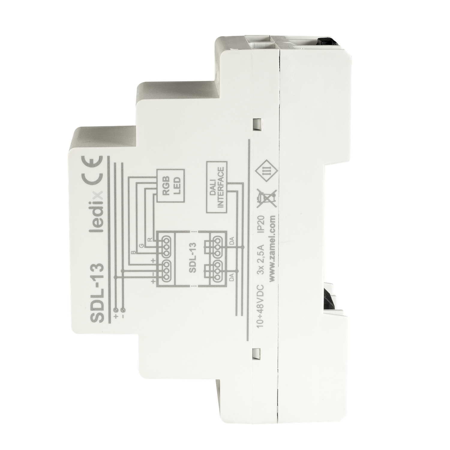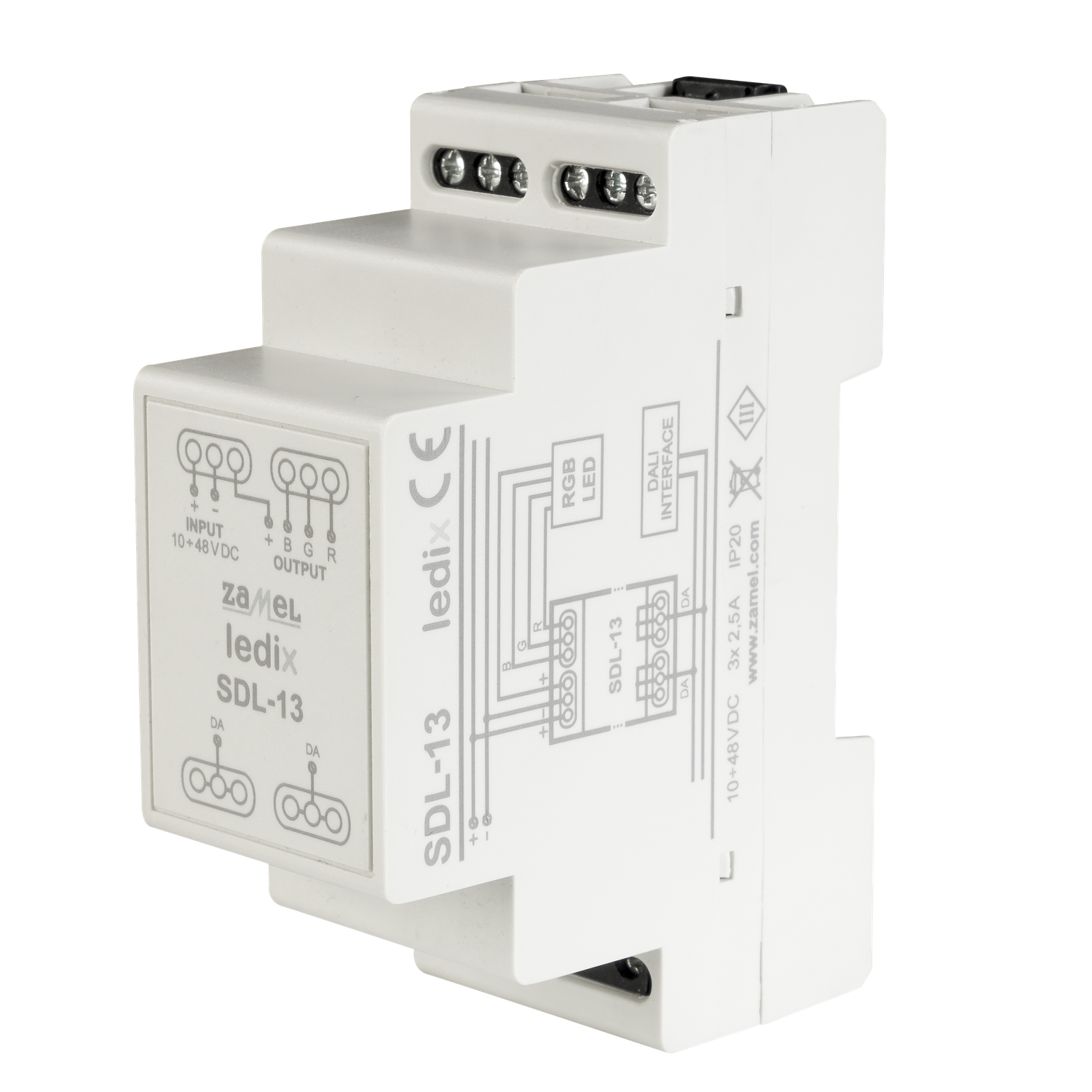 Sterownik DALI SDL-13 przeznaczoy jest do sterowania diodami LED RGB poprzez magistralę interfejsu DALI. Elementami końcowymi podłączanymi do sterowników mogą być oprawy serii LEDIX w wersji niskonapięciowej, taśmy oraz moduły diodowe. Sterownik konwertuje komunikaty protokołu DALI na wyjściowy sygnał PWM sterujący poziomem świecenia i kolorem diod RGB. Magistralę sterującą stanowią dwie linie, które mogą być prowadzone wspólnie z liniami zasilania. Małe gabaryty umożliwiają łatwy montaż w puszce Ø 60. Sterownik DALI umożliwia łatwą implementację produktów LED w rozbudowanych systemach oświetleniowych, których działanie oparte jest na interfejsie DALI. SDL-11 może również pełnić rolę sterownika w autonomicznych systemach oświetlenia LED.