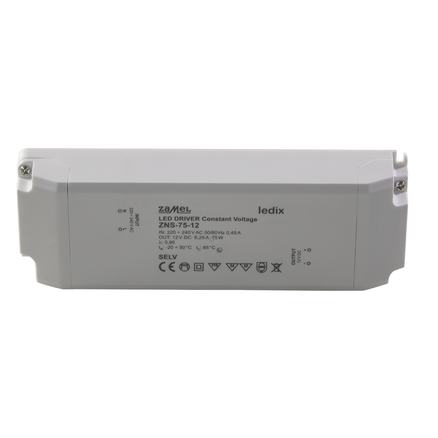 Zasilacz serii ZNS to profesjonalny zasilacz impulsowy o stabilizacji napięciowej 12 V DC. Przeznaczony jest do montażu natynkowego. Produkt posiada zabezpieczenia przeciwzwarciowe oraz przeciążeniowe, które zwiększają bezpieczeństwo jego użytkowania. Wysoka sprawność oraz bardzo mały pobór mocy w trybie czuwania sprawiają, iż jest to rozwiązanie bardzo ekonomiczne, przeznaczone do pracy ciągłej. Zasilacz spełnia wymagania norm zharmonizowanych. Ze względu na swoje gabarty idealnie nadaje się do montażu min. w meblach oraz sufitach podwieszanych.