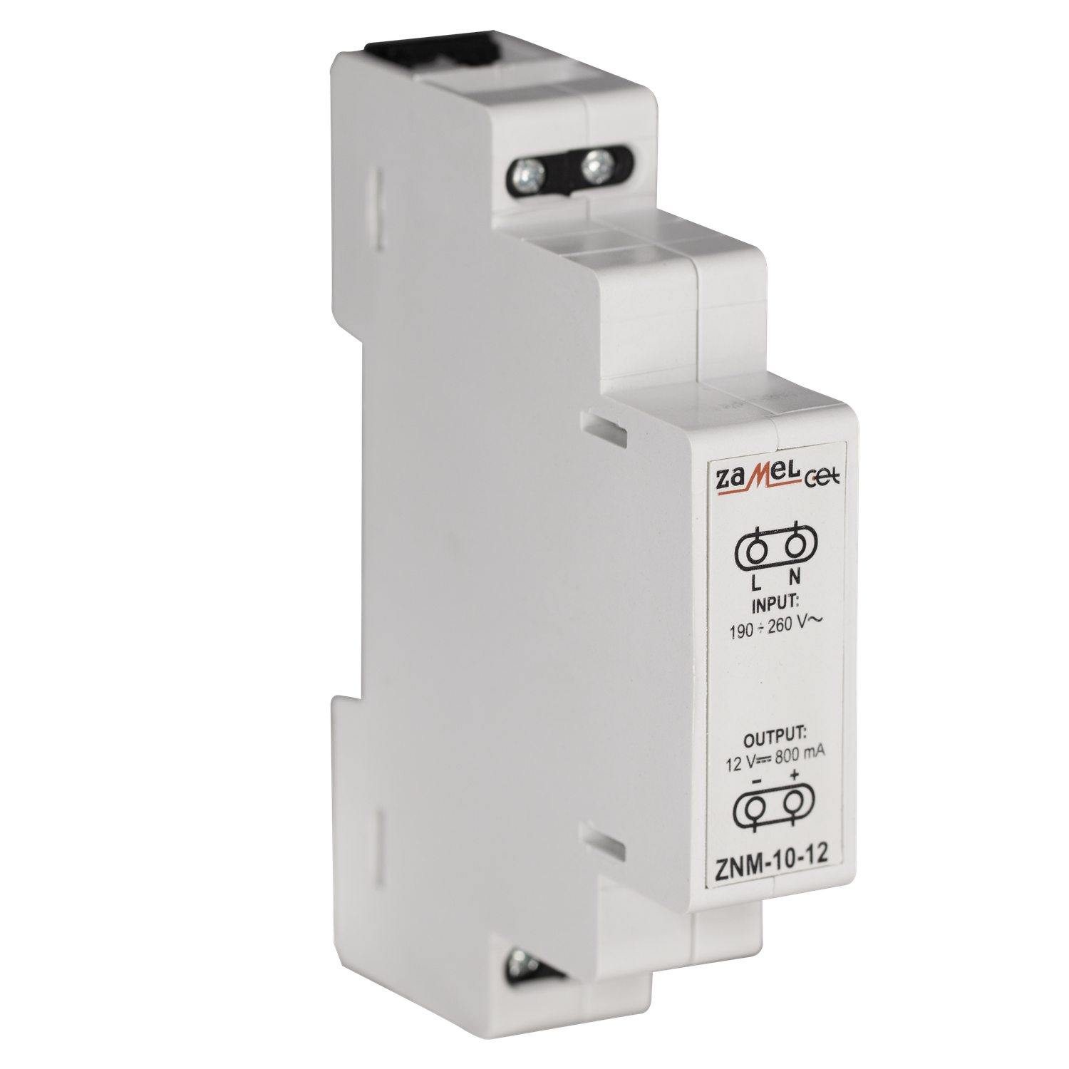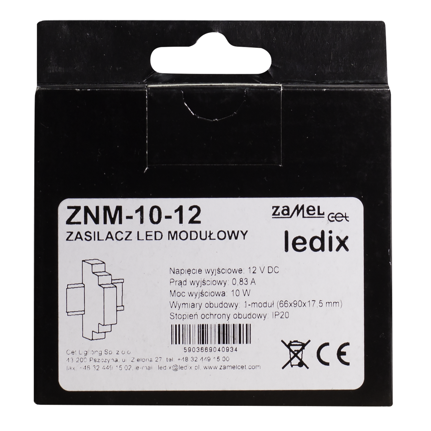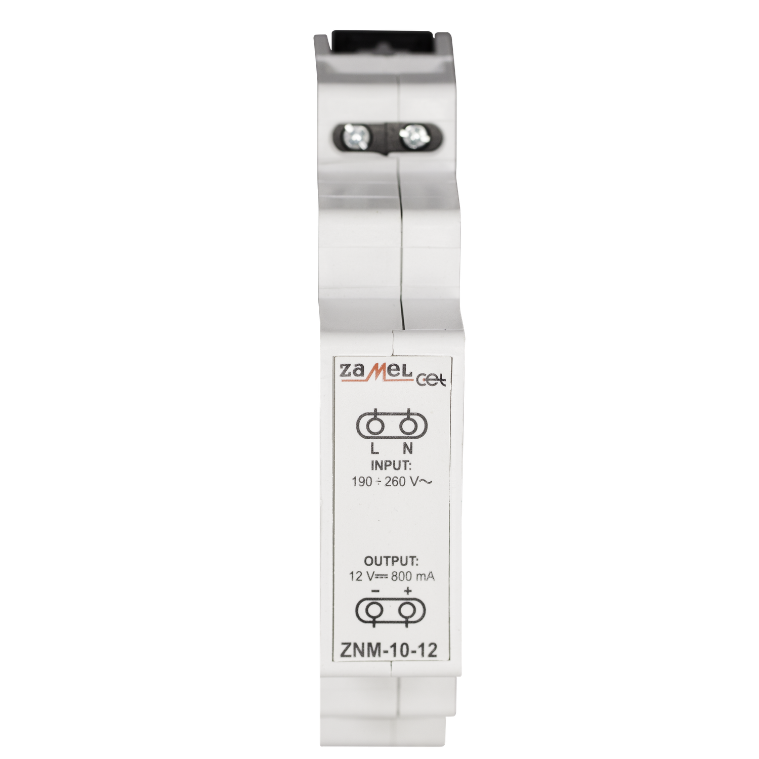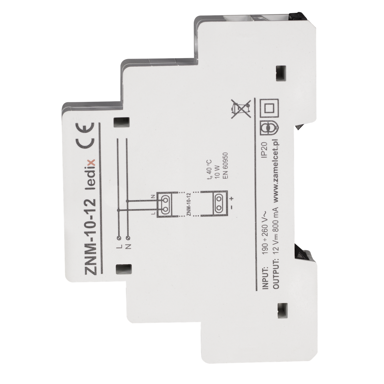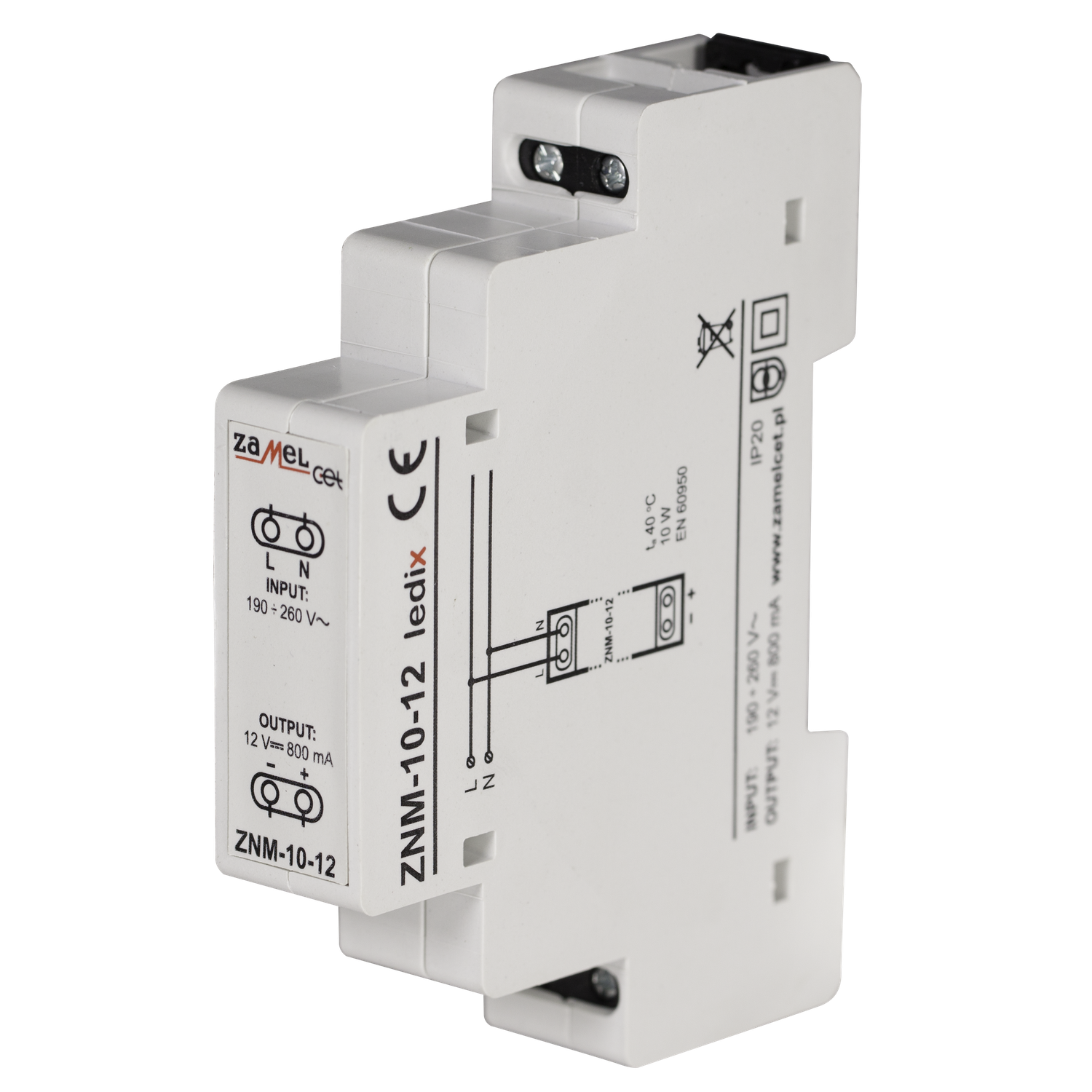 Zasilacz ZNM-10-12 to profesjonalny zasilacz impulsowy przeznaczony do montażu w rozdzielnicach na szynie TH35. Moc wyjściowa zasilacza to 10 W, a nominalna wartość napięcia wyjściowego to 12 V DC. Zasilacz przeznaczony do współpracy z osprzętem LEDIX takim jak sterowniki, odbiorniki radiowe oraz innymi produktami LED zasilanymi napięciem o wartości 12 V DC. Produkt posiada zabezpieczenia przeciwzwarciowe oraz przeciążeniowe, które zwiększają bezpieczeństwo jego użytkowania.
