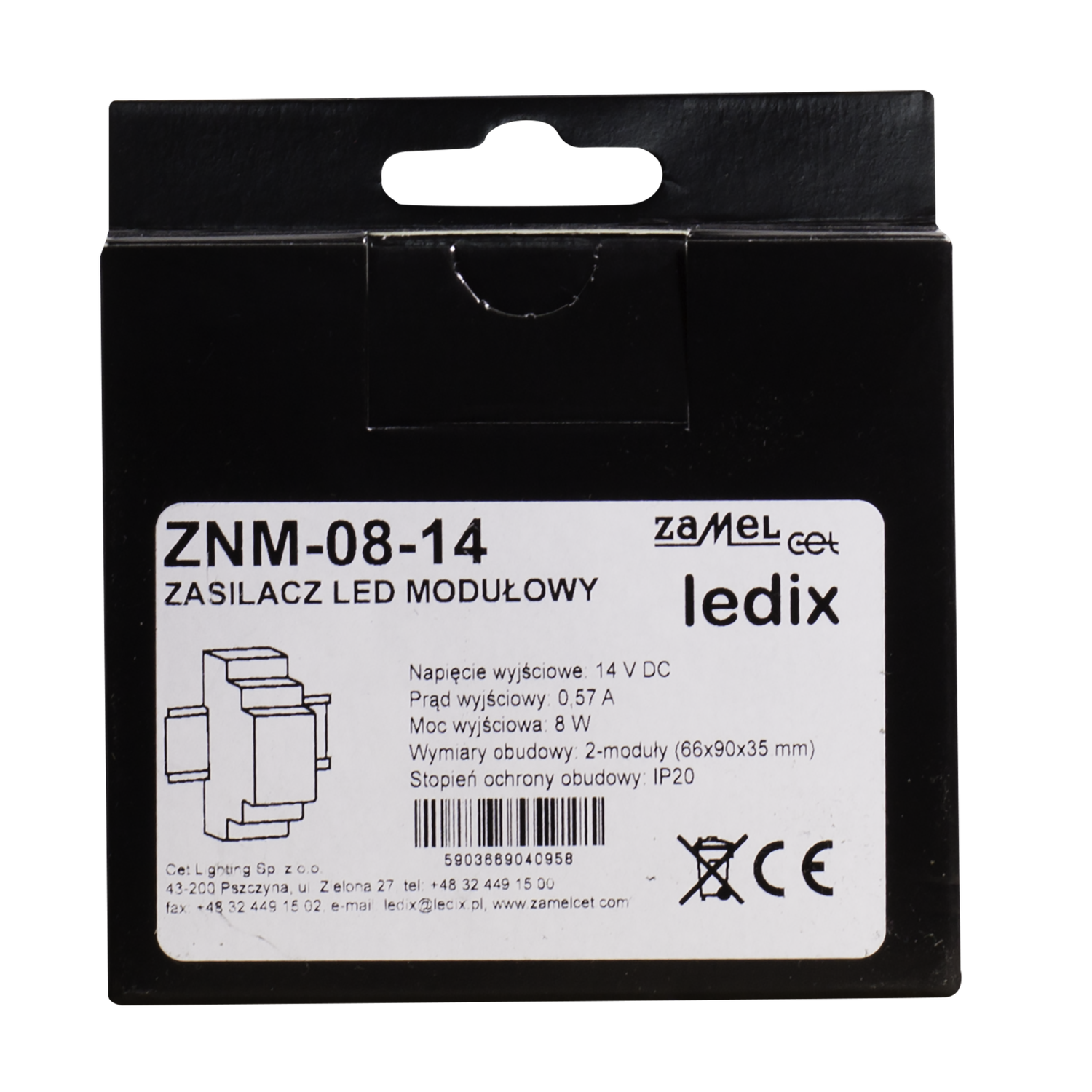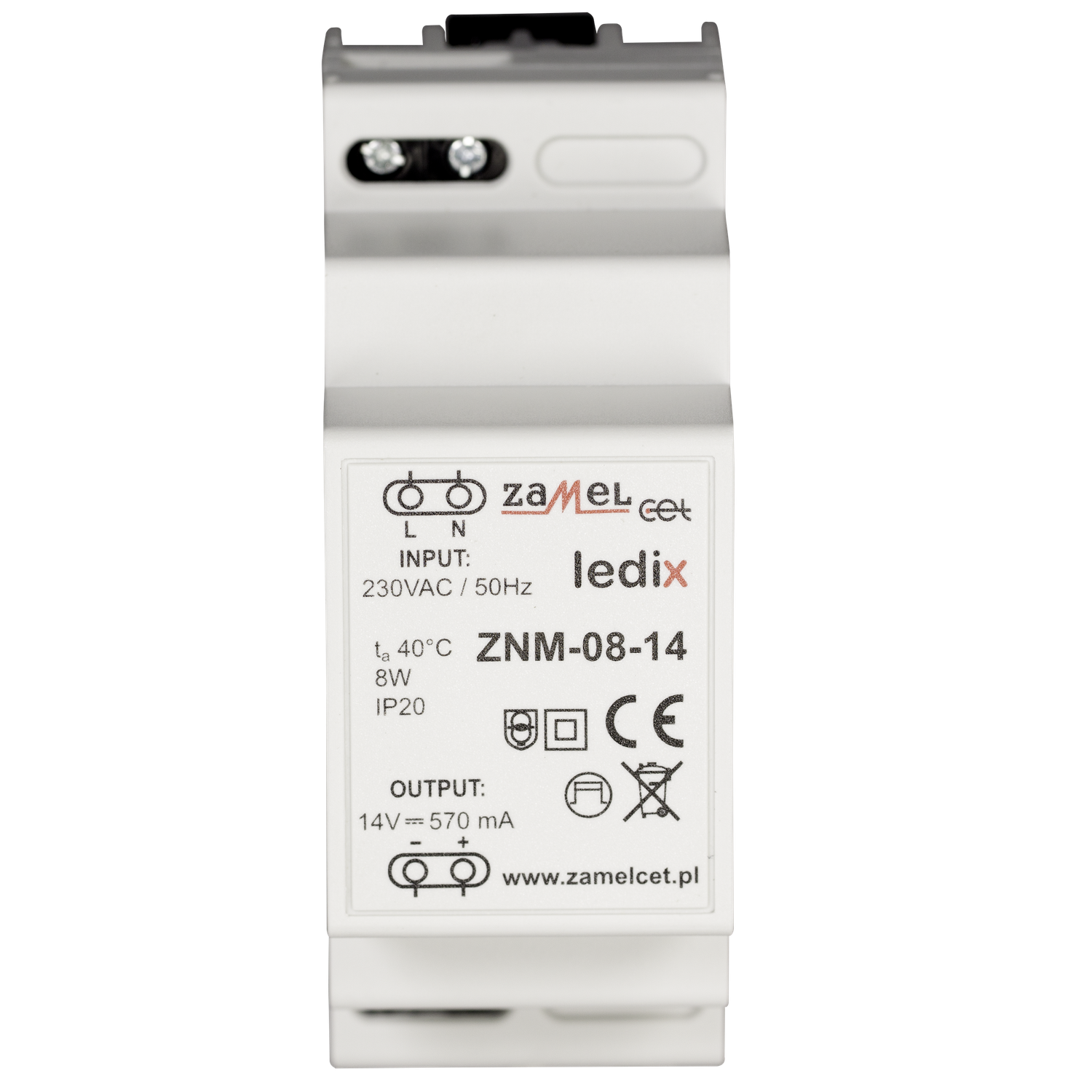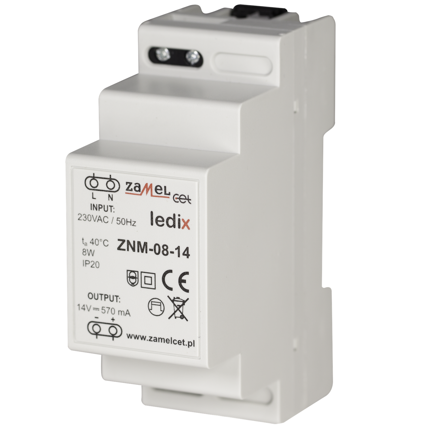 Das Netzteil ZNM-08-14 ist ein professioneller Impuls-Netzteil mit einer Spannungsregelung von 14 V DC. Das Netzteil ist zur Verwendung mit Produkten aus der Ledix-Serie bestimmt. 2-Modulares Gehäuse für DIN-Schiene geeignet. Sehr geringe Leistungsaufnahme im Stanby-Modus, eine hohe Effizienz von ca. 79%, eine hohe Stabilität der Ausgangsspannung und eine lange Zuverlässigkeit.