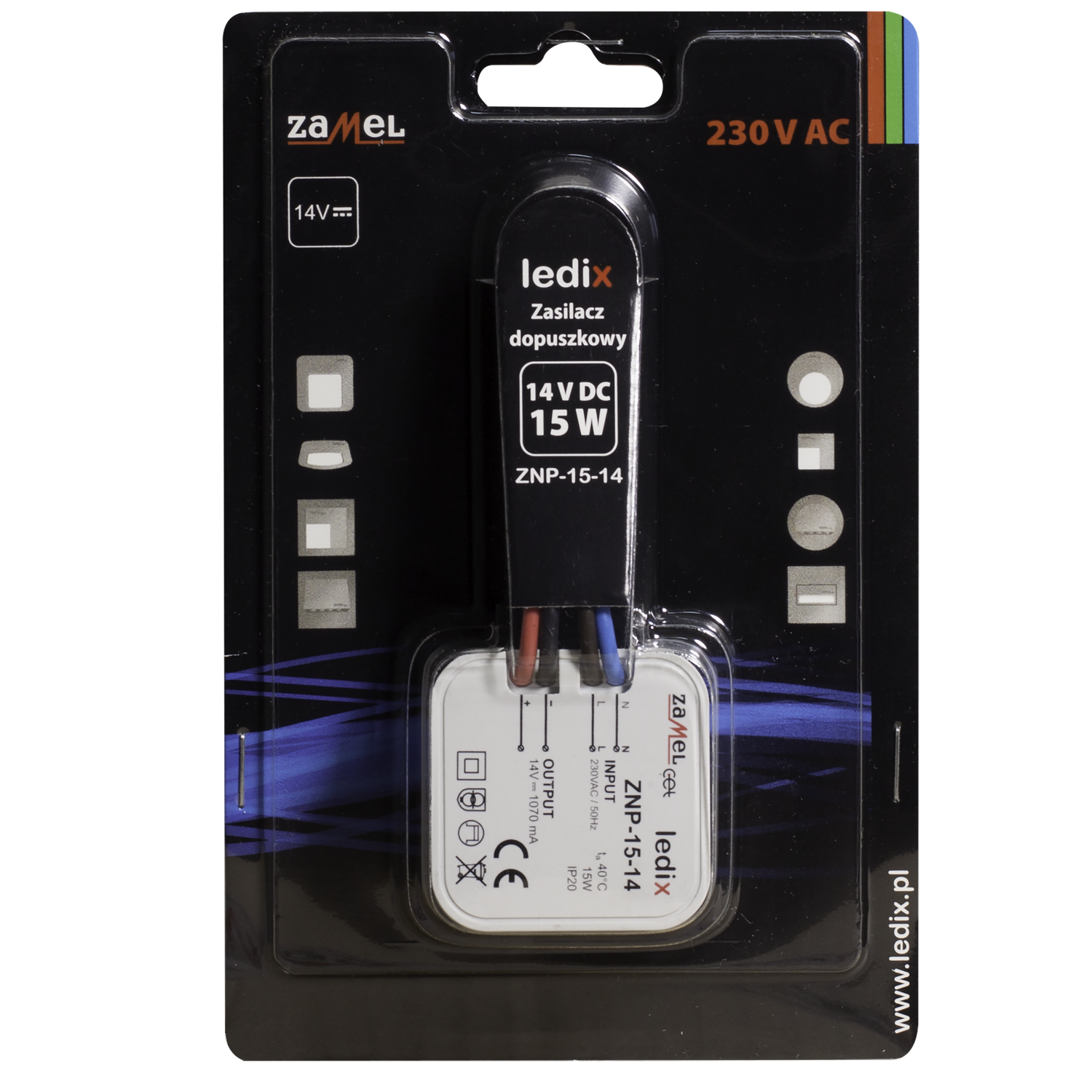 Netzteil ZNP-15-14 ist ein professioneller Impuls-Netzteil mit einer Spannungsregelung von 14V DC und Nennleistung von 15W zur Montage in UP-Dose. Das Netzteil ist zur Verwendung mit Produkten aus der Ledix-Serie und mit Standard-LED-Elementen bestimmt. Netzteil hat ein Kurzschluss- und Überspannungsschutz. Sehr geringe Leistungsaufnahme im Standby-Modus.