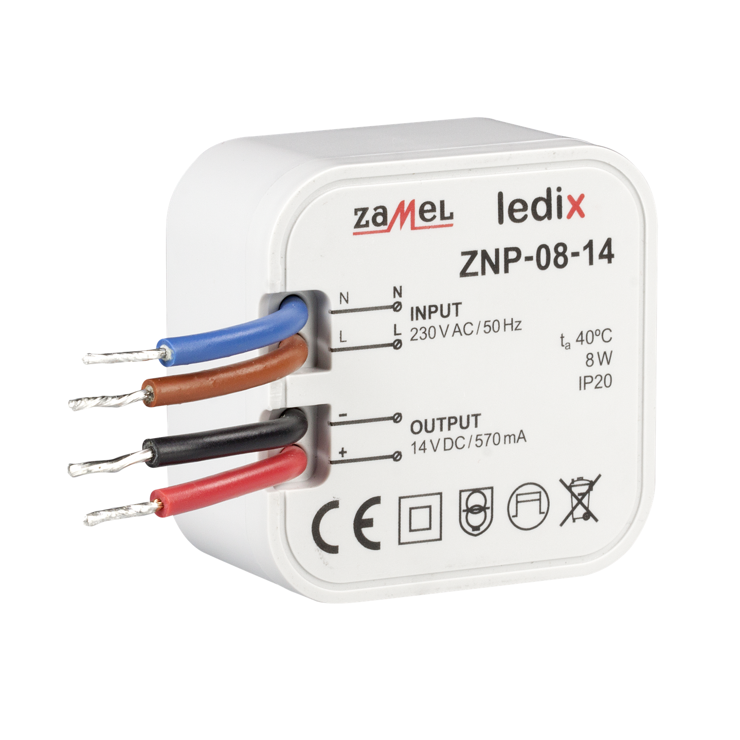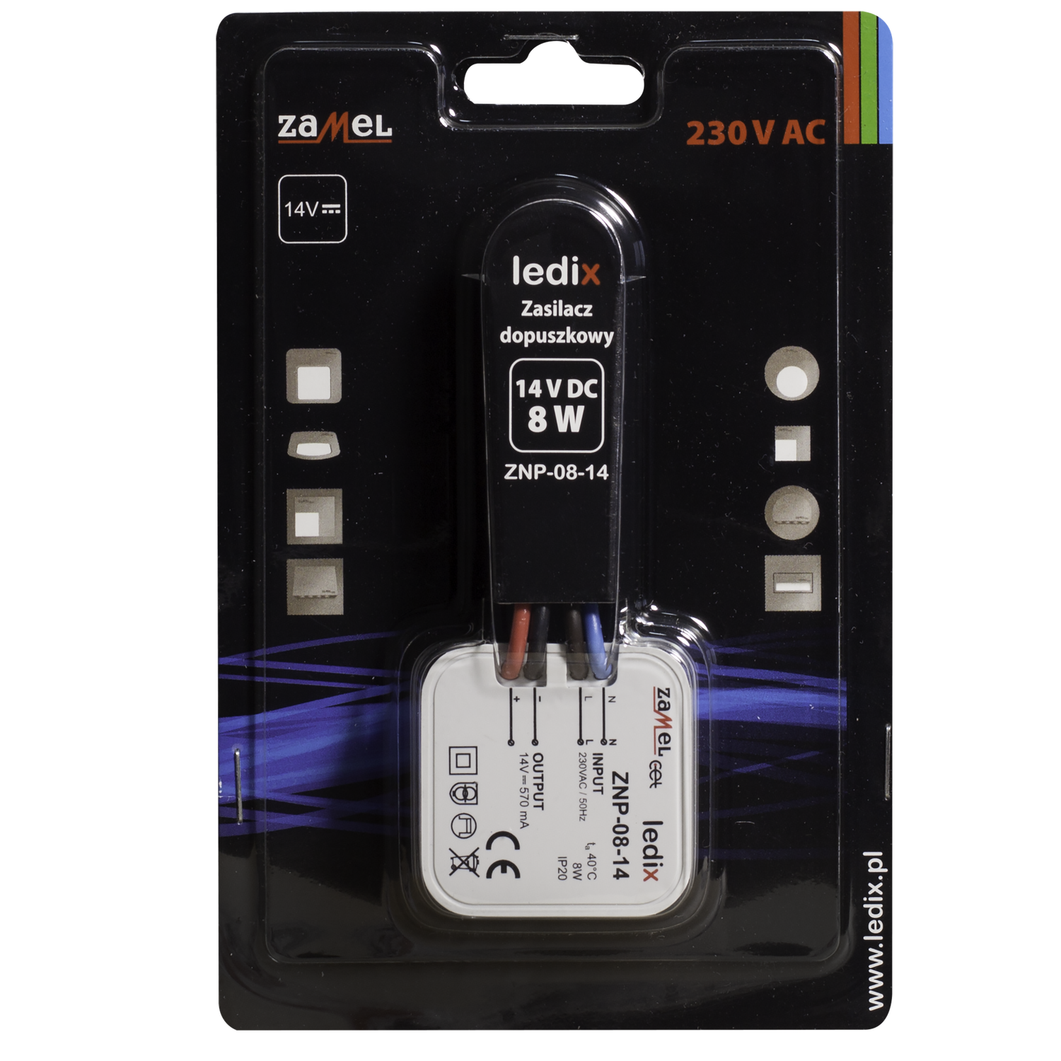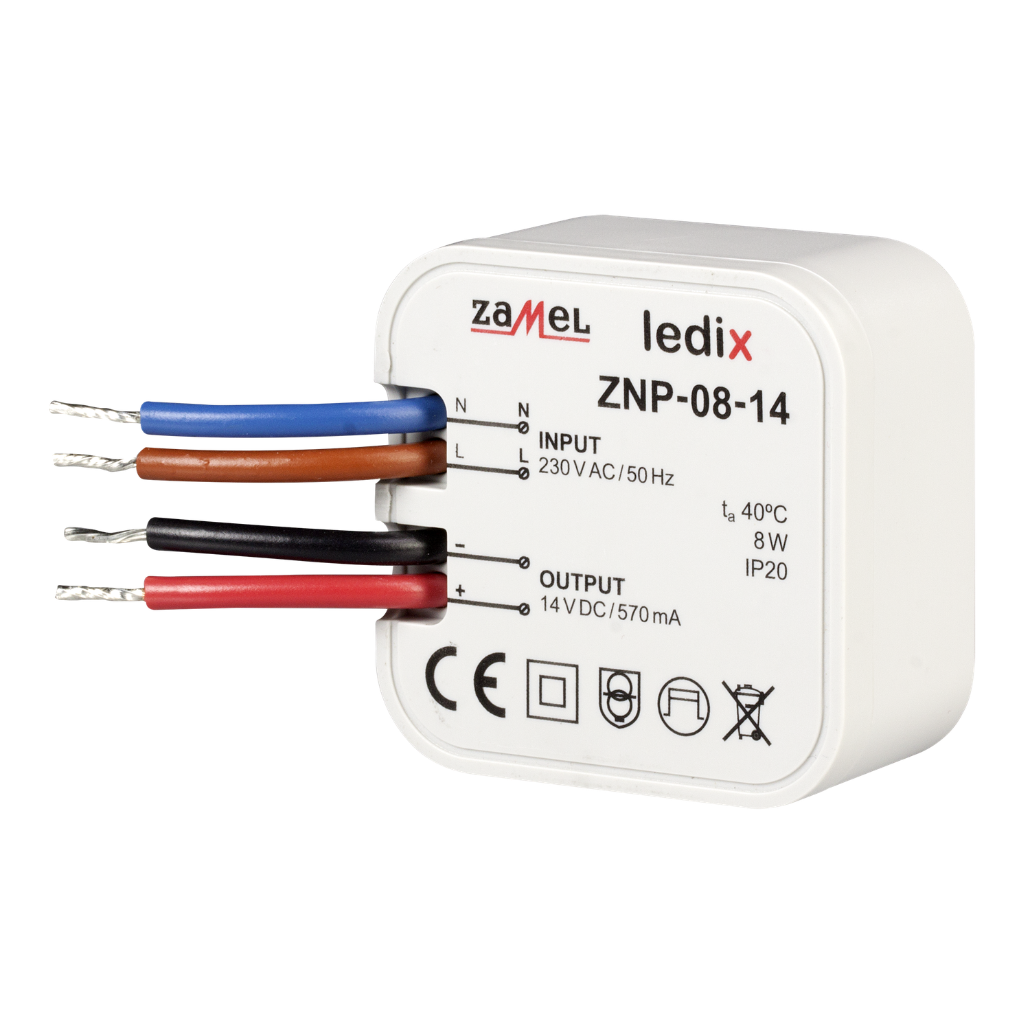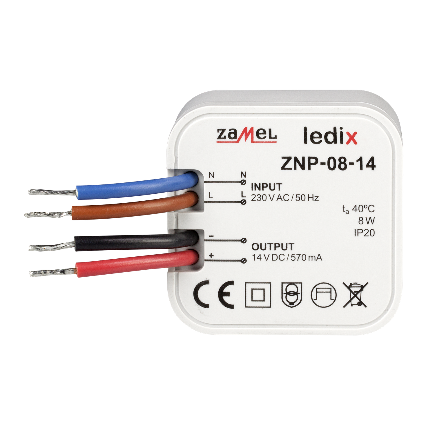 Netzteil ZNP-08-14 ist ein professioneller Impuls-Netzteil mit einer Spannungsregelung von 14V DC und Nennleistung von 8W zur Montage in UP-Dose. Das Netzteil ist zur Verwendung mit Produkten aus der Ledix-Serie und mit Standard-LED-Elementen bestimmt. Netzteil hat ein Kurzschluss- und Überspannungsschutz. Sehr geringe Leistungsaufnahme im Standby-Modus.