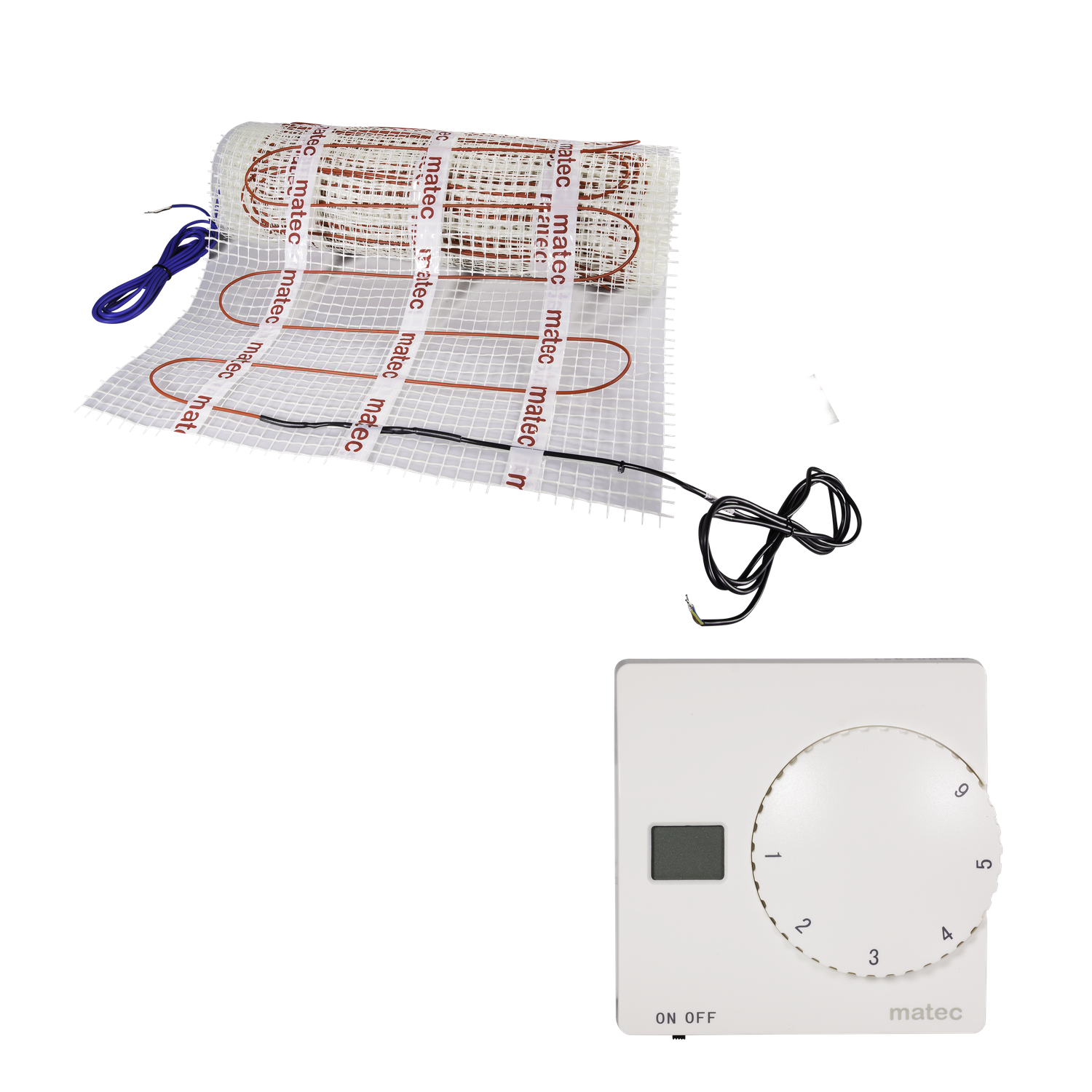Set für Fußbodenheizung. Das Set beinhaltet eine Heizmatte mit zweiseitigem Netzanschluss mit einer Heizoberfläche von 1,5m², ein Schutzrohr, eine Unterputzdose und einen manuellen Temperaturregler RTS-01A.