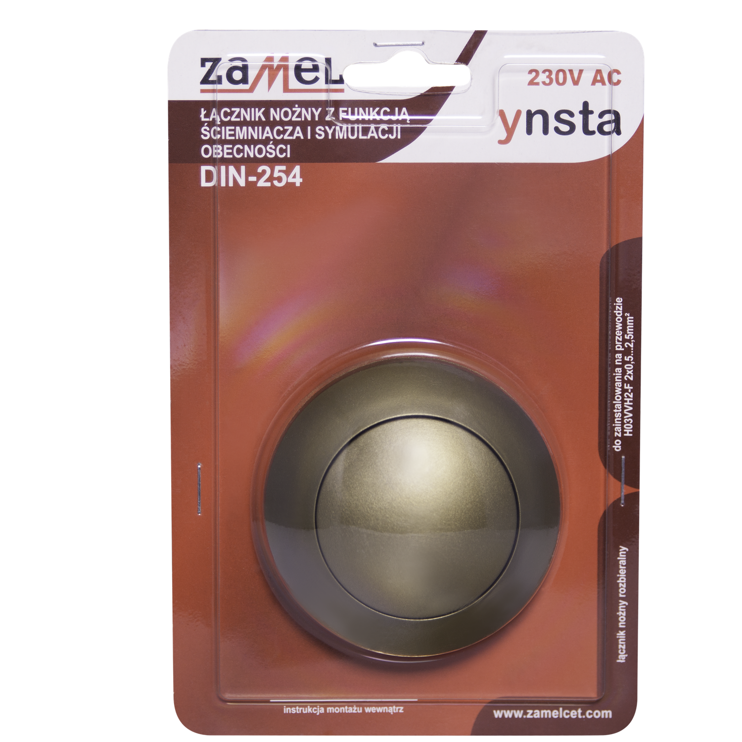 Łącznik nożny z funkcją ściemniacza oraz symulacji obecności typu DIN-254. Zastosowana funkcja w sposób płynny umożliwia regulację natężenia światła oraz samoczynnie włącza i wyłącza zasilanie sterowanego odbiornika w losowo zaprogramowanych odstępach czasowych. Wtyczka płaska, lana. Może służyć do włączania, wyłączania i sterowania poziomem natężenia oświetlenia żarowego konwencjonalnego, halogenowego 230V, halogenowego 12V. Współpraca z transformatorami elektronicznymi, toroidalnymi i konwencjonalnymi.